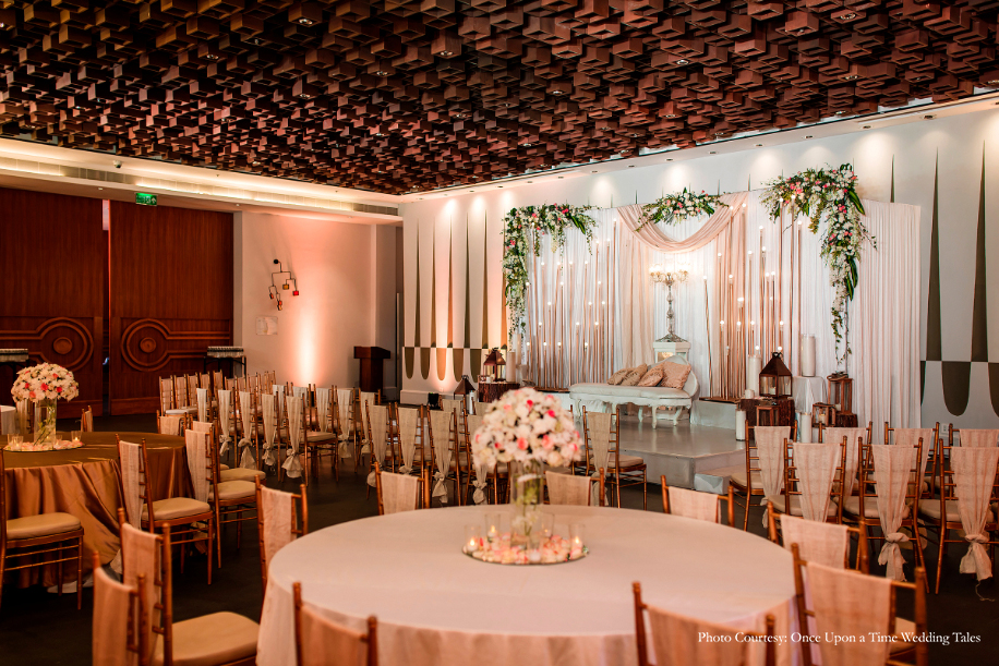 The decor and vibe of this function was definitely more traditional and simple, with shades of white, brown, and pink as the color palette. The stage was beautifully done with rustic lanterns on wooden stumps and minimal floral accents on the edges, and rose gold bulb standees lining the backdrop. The theme of the menu was ‘When Hyderabad Meets Chennai’, as I consider my hometown to be Hyderabad (my birthplace).”