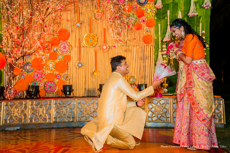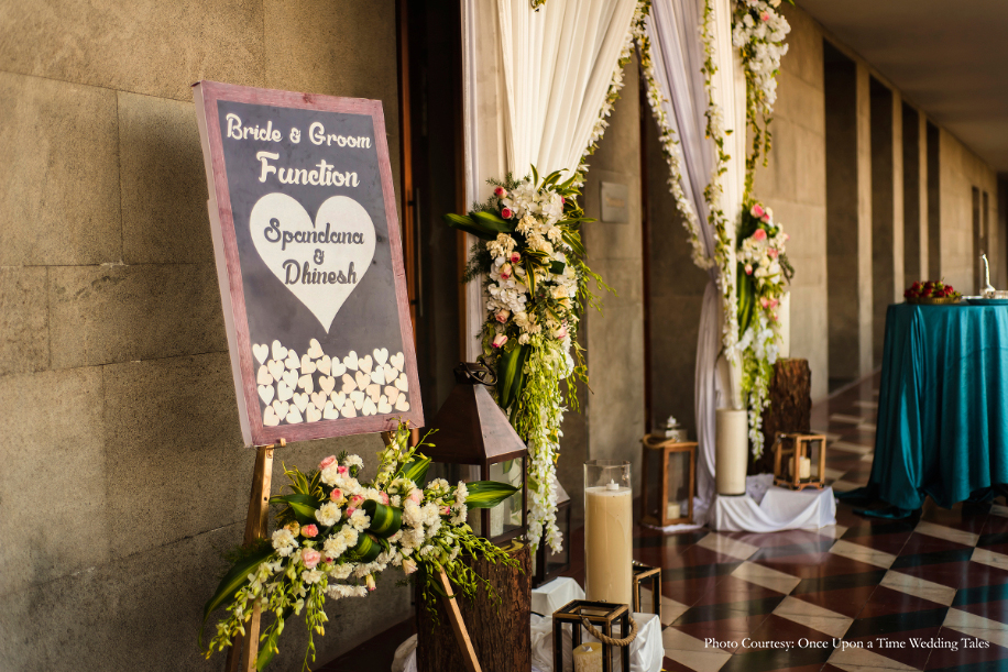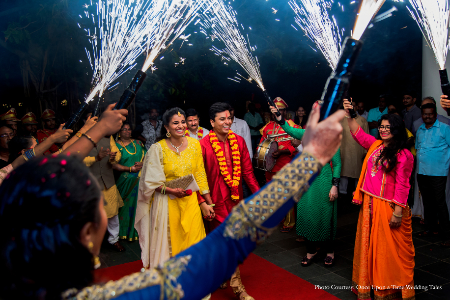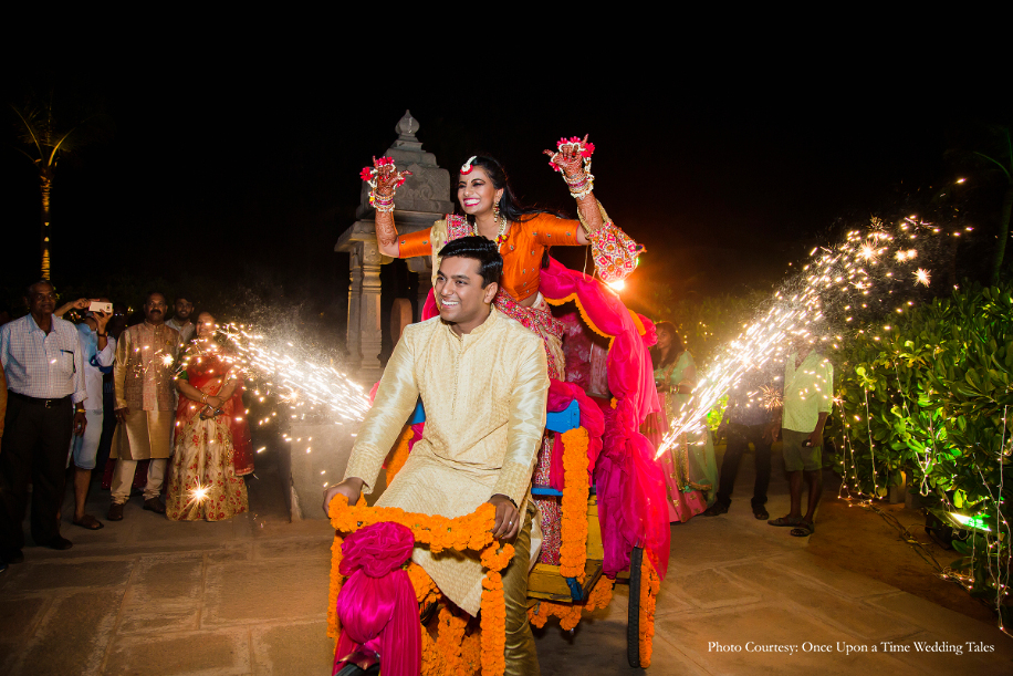 “The bridegroom function (at Samaya – the indoor banquet hall) is called maapillai azhaippu in our culture. The bride’s family welcomes the groom’s family, there is an exchange of gifts and certain rituals are performed, including the elders of our families acknowledging on paper that we are getting married. Dhinesh and his family went to a nearby temple, as per tradition, before they entered the resort. Dhinesh had a grand baraat, where he entered the resort on a decorated horse, after which we both entered the function as our sisters and cousins held up sparklers. It felt super special.