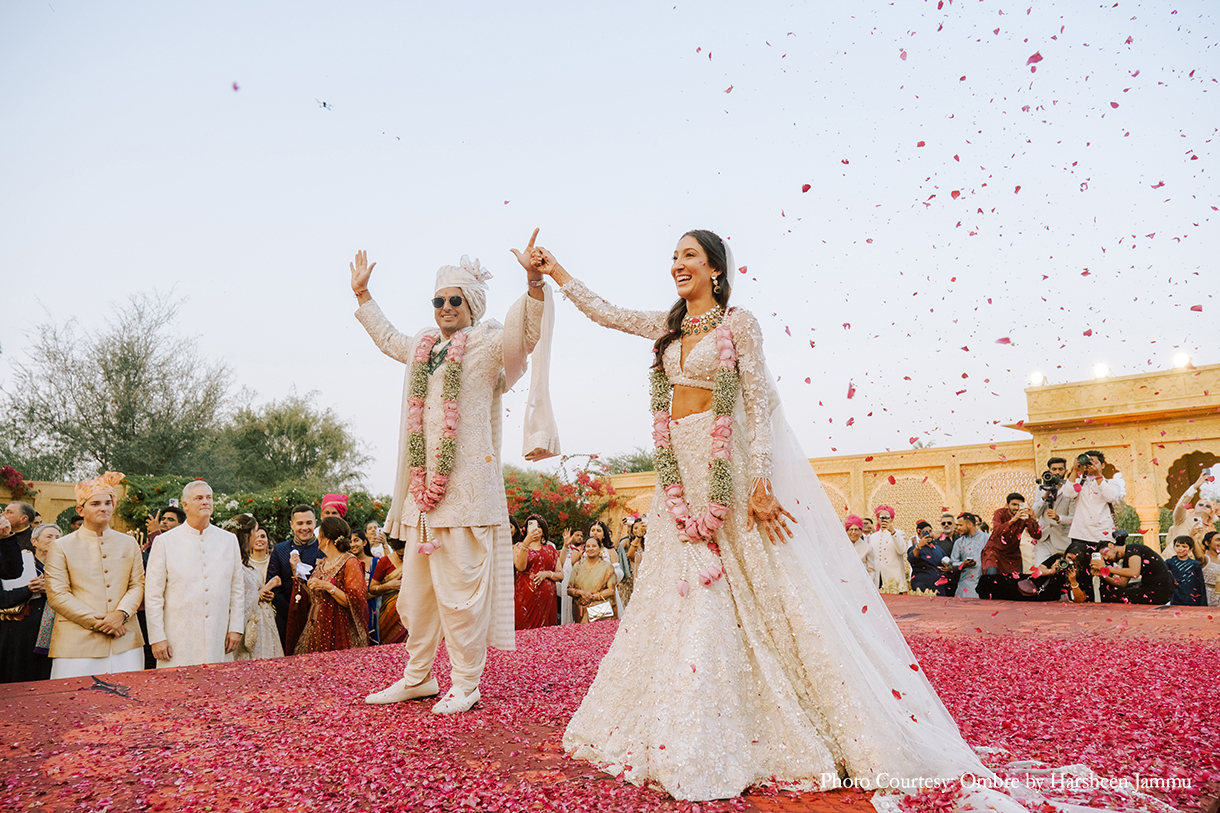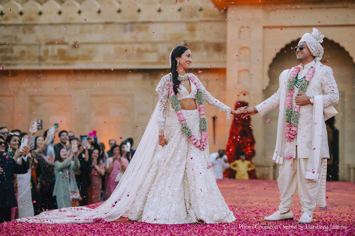 The 3-day destination wedding was hosted at the heritage Fort venue of Suryagarh in Jaisalmer. They roped in the renowned team of Krayonz Entertainment to plan and conceptualize every detail to perfection, while The Wedding Square executed all their decor concepts with unmatched finesse and creativity. A powerhouse team of vendors and entertainers came together to take their celebrations to the next level, including DJ Ganesh and the band Best Kept Secret.