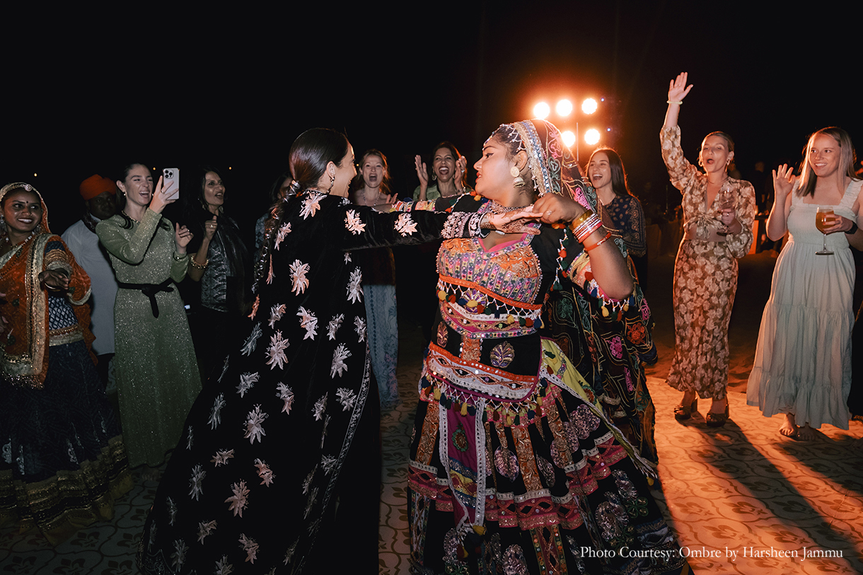 Their guests arrived from all over the world to a royal welcome at Jaisalmer’s iconic Suryagarh. The couple invited their loved ones to a magical night out on the dunes, with traditional seating, local entertainment, drinks, and dancing.