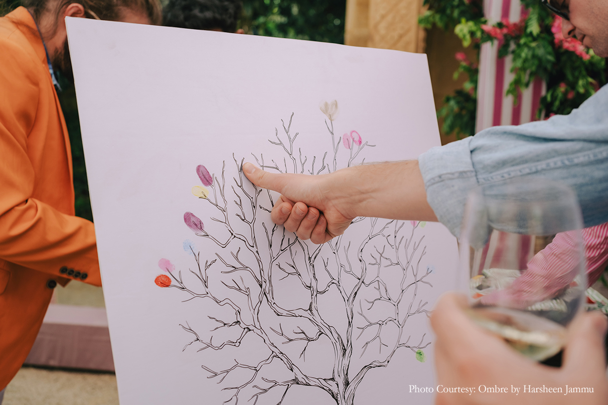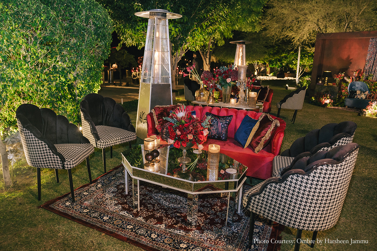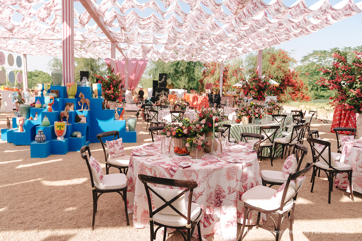 The next day dawned with the earthy yet luxe vibe of the mehndi function, which was hosted outdoors underneath a scalloped canopy of printed drapes. The bohemian decor saw striking floral setups, quirky prints, rustic pottery, and elements inspired by the desert landscape such as cacti vases, and more. A live painting setup called for the guests’ participation, while a live bangle stall, tarot cards, custom cocktails, mehndi artists, and more, added to the experience.