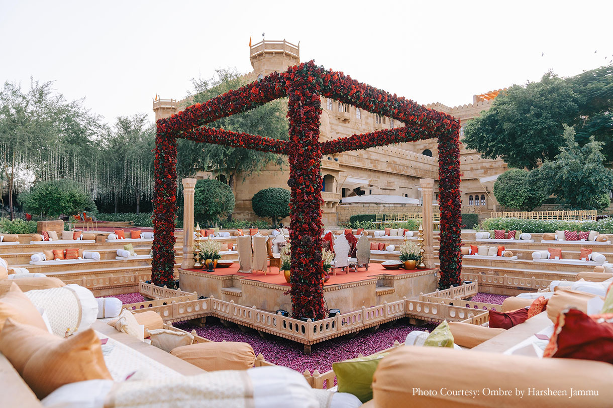 Brimming with decadence but with a touch of contemporary chic, the wedding was straight out of a fairytale. The bridal entry recreated the magic of actor Kiara Advani’s bridal entry, while the rousing baraat led to the iconic bawli of Suryagarh with staggered levels for an amphitheater-style mandap and seating. Plush diwans and bolsters surrounded the steps for the guests to sit on, and roses covered everything, from the mandap to the surface of the pond.