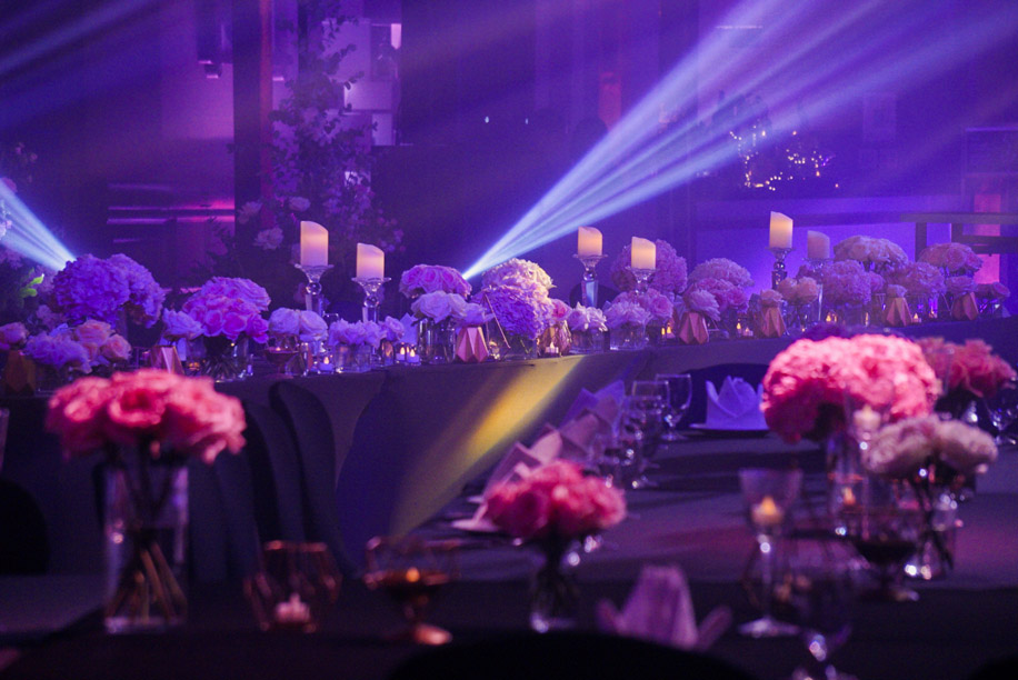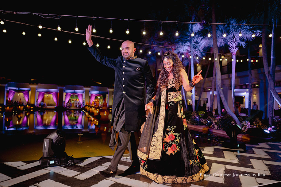 The sangeet had a middle eastern theme that saw an elaborate decoration of the venue using lots of flowers, candles and lanterns. To accompany this theme, they added Afghani food to the menu. The highlight of the function was a gigantic stage that was built on top of a lotus pond which looked magical. The to-be-weds entered the venue wearing matching black and gold outfits. Subikksha picked a lehenga by Rohit Bal while Vik went in with a Rohit Gandhi + Rahul Khanna bandhgala.