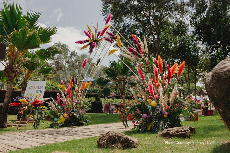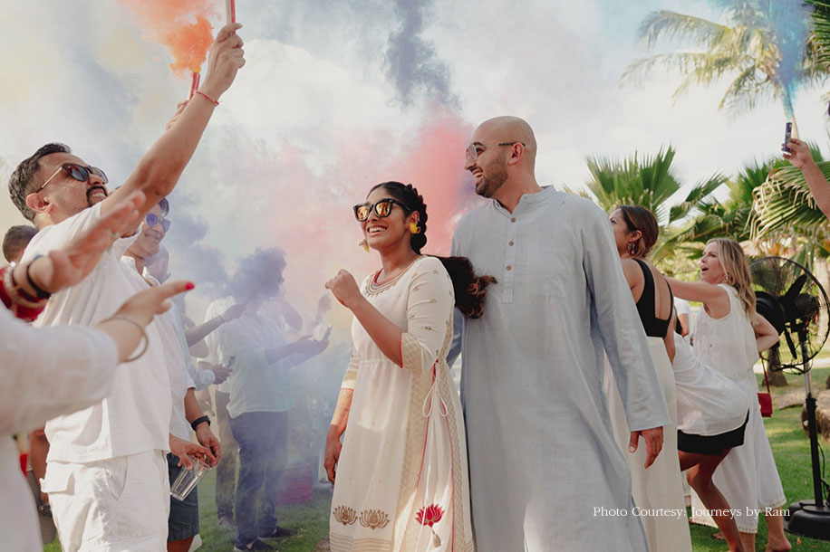They kick-started their wedding functions with a laid-back welcome dinner by the beach for their guests to relax after a long flight. The entire venue had all-white vibes with rustic textured elements incorporated with white drapes, off-white hanging lamps, fresh white flowers and beige coloured dry flowers, currently the hottest floral trend in wedding decor. The fresh white blooms against dried elements such as palm leaves, branches, seedpods, and gardenscapes lent a beautiful sun-kissed warm tone under the sunset near Phuket waters. They welcomed their guests with garlands, Thai dancers, a saxophonist, and warm hugs. They spent the entire evening sharing stories with friends and family many of whom they were meeting after several years. The couple were twinning in blush pink outfits where the bride wore a jumpsuit saree designed by Vik’s cousin, Nidhi Bhasin and the groom picked a simple kurta from Rohit Gandhi + Rahul Khanna.