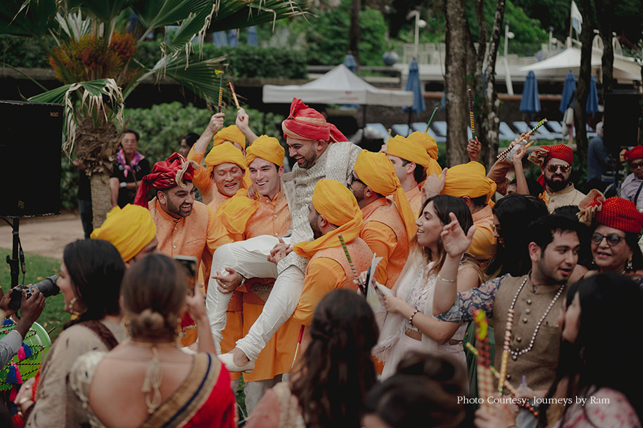 For their mehndi function, they wanted the event to be colorful, interactive and fun with live barbeques organised in the backyard. Their guests played beer pong, applied Holi and threw water balloons at each other. The couple, along with their friends and family, entered the venue wearing white and pastel-coloured outfits. The bride picked a pista-green lehenga with a shocking pink dupatta by Madsam Tinzin and the groom color-coordinated in a green kurta and afghani pant which he paired with a white and orange Nehru jacket. Soon after the splashing of the colors was over, the couple along with their guests ran onto the beach making their mehndi function even more eventful.