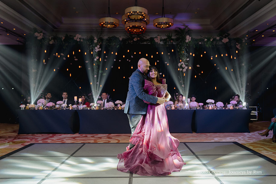 The finale of their grand celebrations was their reception. For the evening, the maid of honor and the best man had their speeches ready, followed by the couple’s first dance as husband and wife. Their cousins gave solo dance performances, but in the end, the groom vowed the bride with his surprise dance performance with his crew. And then, they all took to the dance floor and partied all night long. Their decor had elements of black and pastel pink in it. The star couple of the hour looked stunning as they entered together holding hands and dancing to upbeat music. Subikksha wore a custom-made Gaurav Gupta blouse with exaggerated sleeves and a flared layered skirt that resembled a flowering rose in a purple shade. Vik picked a blazer set from Rohit Gandhi + Rahul Khanna and looked equally dashing.