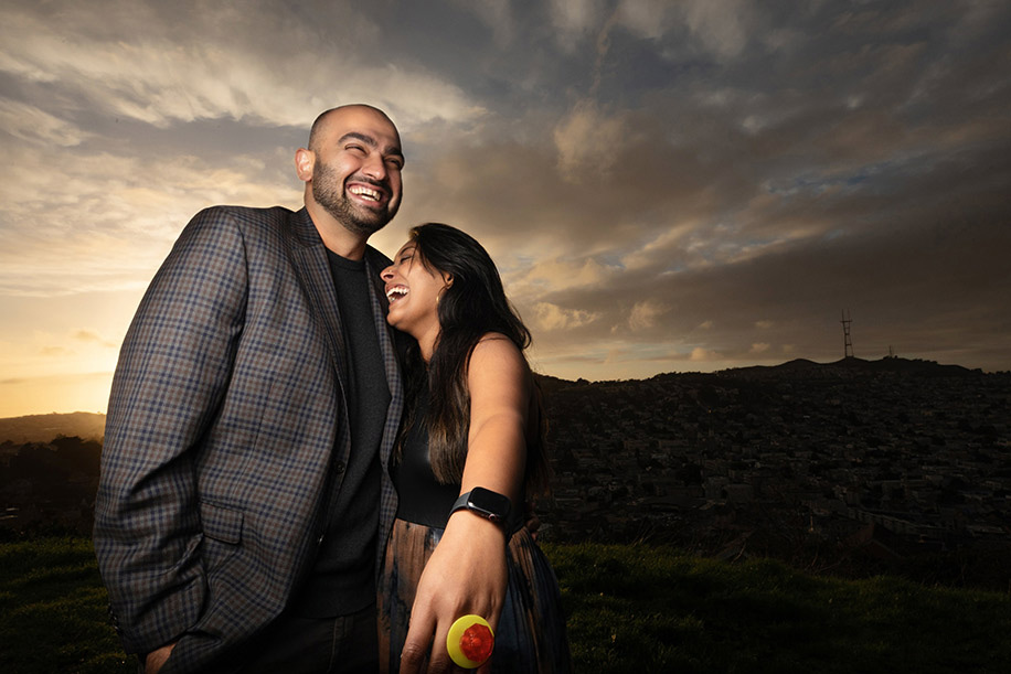 “Vik planned a random ‘work from home’ day on January 9, where he attempted to woo me by planning a day of massages. He also chose a fancy spot for lunch, followed by a short walk with Mowgli at our usual spot, Bernal Peak. During our walk, the orange sky with the setting sun was surreal and we started shooting pictures as we were already in fancy attire. I spotted a person with a camera and thought of asking him to click all three of us against the stunning backdrop. Before I could approach him, Vik went on one knee and gave me a candy ring pop (a lollipop). Amidst a hearty laugh, I started walking up towards the photographer. When I turned back around, I saw Mowgli holding a sign that read ‘Will you marry my Papa?’ To my surprise, Vik was yet again down on one knee, but this time he was holding a box in his hand. It wasn’t until I said ‘Yes’ that I saw the ring that was custom designed by him. We celebrated at our favorite spot with champagne where he had planned yet another surprise with our closest friends who were patiently waiting to celebrate our future together”, recollects the happy bride.