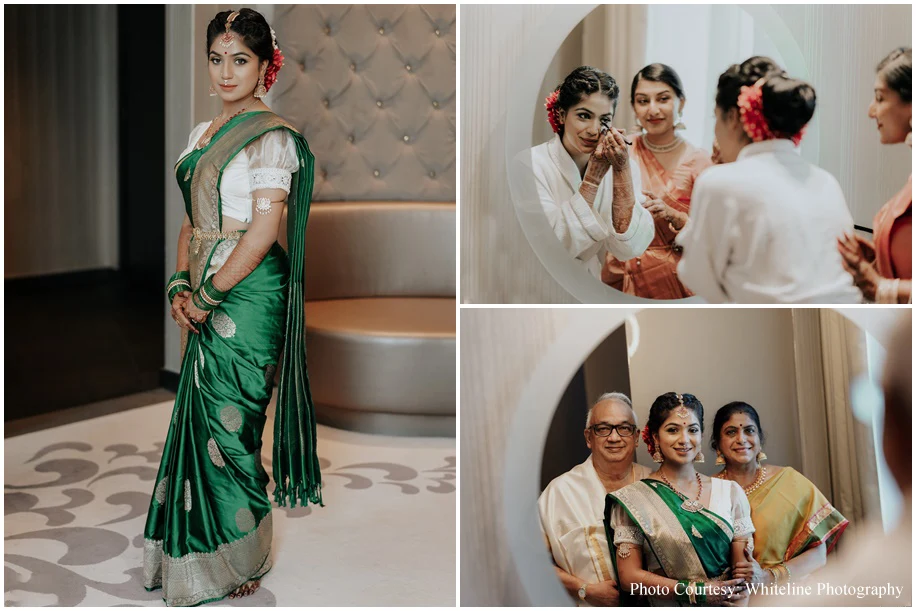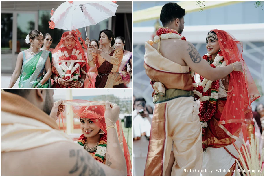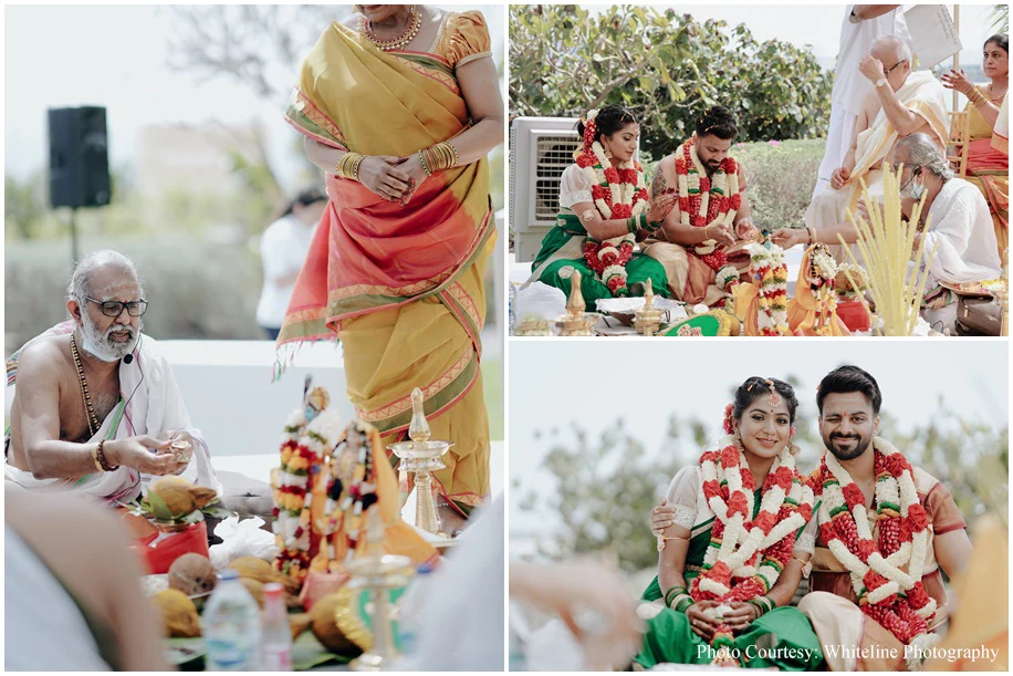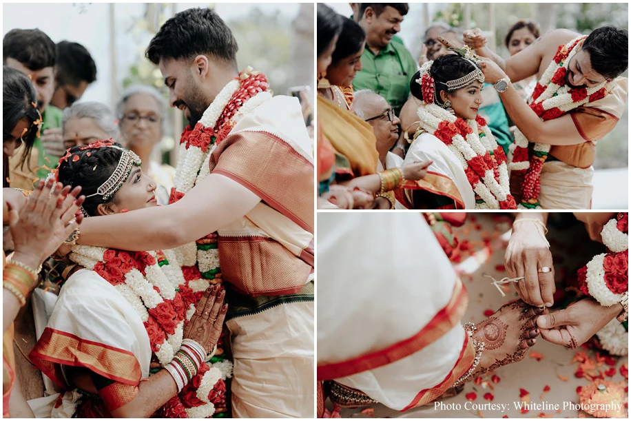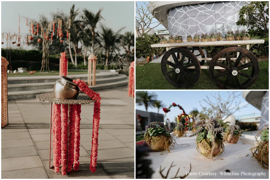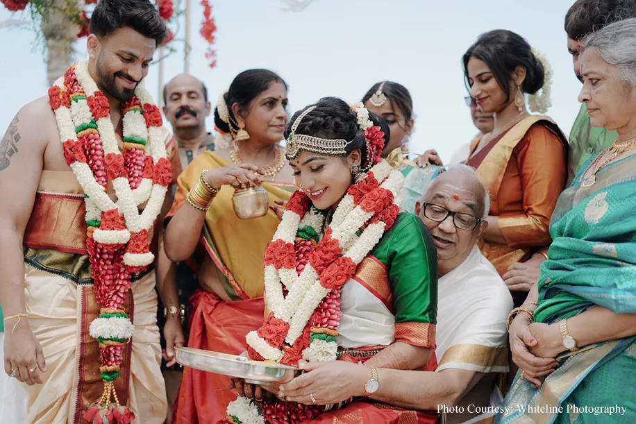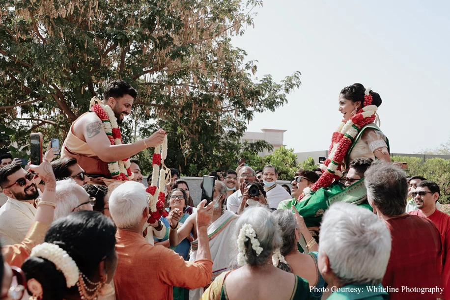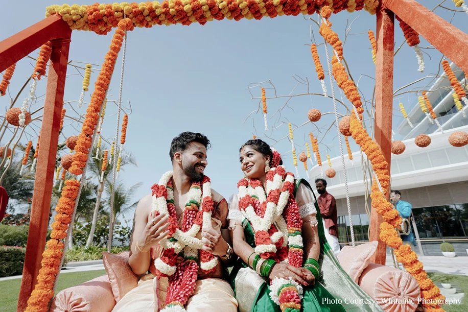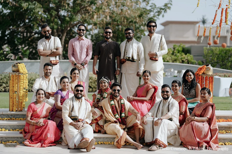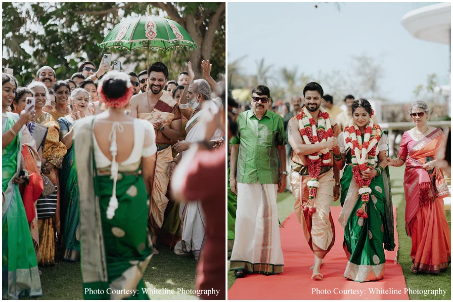 It was a fusion Wedding with the bride hailing from Tamil Nadu and the groom from Kerala. A swing ceremony kicked off the celebrations and the guests were treated to a sadya lunch where food was served on banana leaves. Jyoti goes on to share, “Sudakshina and Dheeraj’s wedding incorporated several traditional elements like wedding bells, marigolds and palm trees. Adding to the traditional vibe were the tunes of the Nadaswaram.”