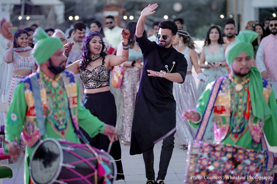 Jyoti Jalan Kohli from OH! So Desi Events shares, “The couple was very keen on a pop-art themed Sangeet which steered clear of the usual setups! The sundowner event had pop art incorporated into the decor thoroughly right from the DJ’s booth to the photo booth along with the couple’s customised logos. Plus, we also incorporated a cake baked by the bride into the decor along with various other candies and lollipops. The duo made an entry dancing to the beats of the Dhol followed by their entire family. The menu was specifically curated with only live stations to incorporate food that the bride and groom loved.” Safe to say, the event was punctuated by stunning performanceschoreographed by the groom’s sisters, but it was the bride that stole the show with their incredible belly Dance Performance.