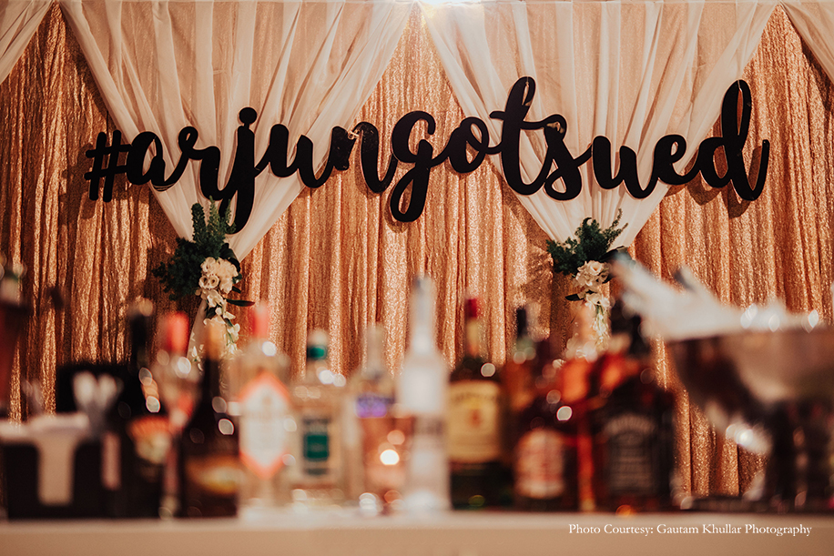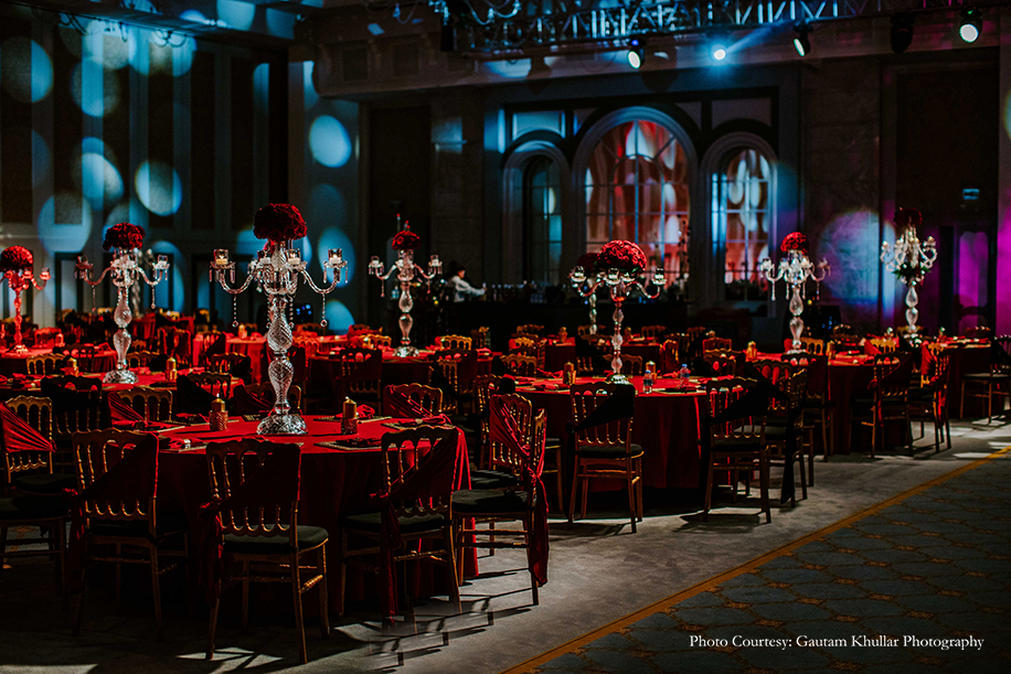 “Our reception took on a very regal mood with the decor in the colors of red and gold. We brought in lots of roses and glowing candles. I wore a grey gown with green and blue bugle beads by Gaurav Gupta for the reception. It was an edgier pick, but it won my heart the moment I saw it. Arjun opted for a black tuxedo from Rohit Gandhi + Rahul Khanna.”