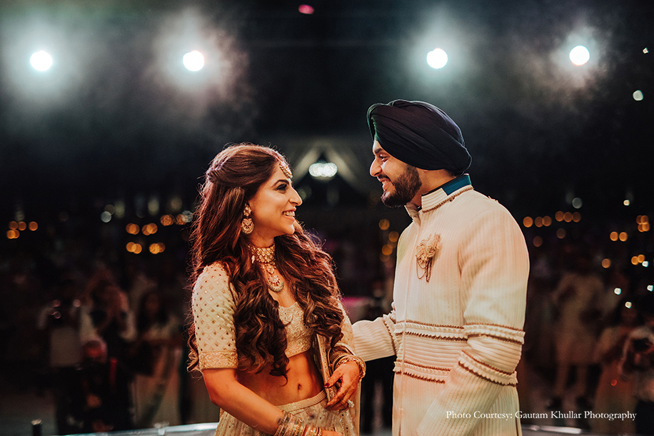 “Our sangeet was an all-white affair. There is no other color that looks as elegant and serene as this one, thus the decor and theme revolved around a palette of white and gold. The setup was minimalistic and elegant and turned out to be just the way I had envisioned it. Being the designers behind the label Sukriti & Aakriti, my sister and I designed my lehenga for this function. It was an off-white chikankari lehenga that featured pastel embroidery along with crystals, sequins, and zardozi work. I matched it to a lotus motif polki necklace, earrings, and pastel bangles.”