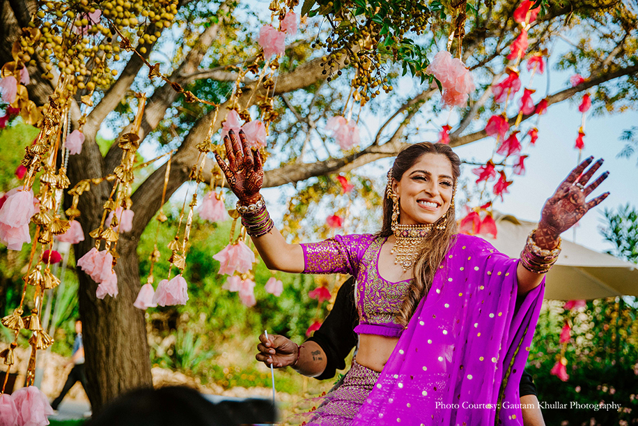 “The theme for this function was ‘Fun in the Sun,’ and it was hosted on the sprawling lawns of the property. The colors we used for the decor here were light pink, fuchsia and gold. There were potlis and drapes that hung from the ceiling of a large canopy under which most of our guests had gathered. Besides this, we had fabric hangings suspended from the branches of the trees. With my entire squad dressed in Sukriti & Aakriti, our label turned out to be the dress code for this function! I wore a rich purple outfit that went perfectly with the mood of the festivities.”