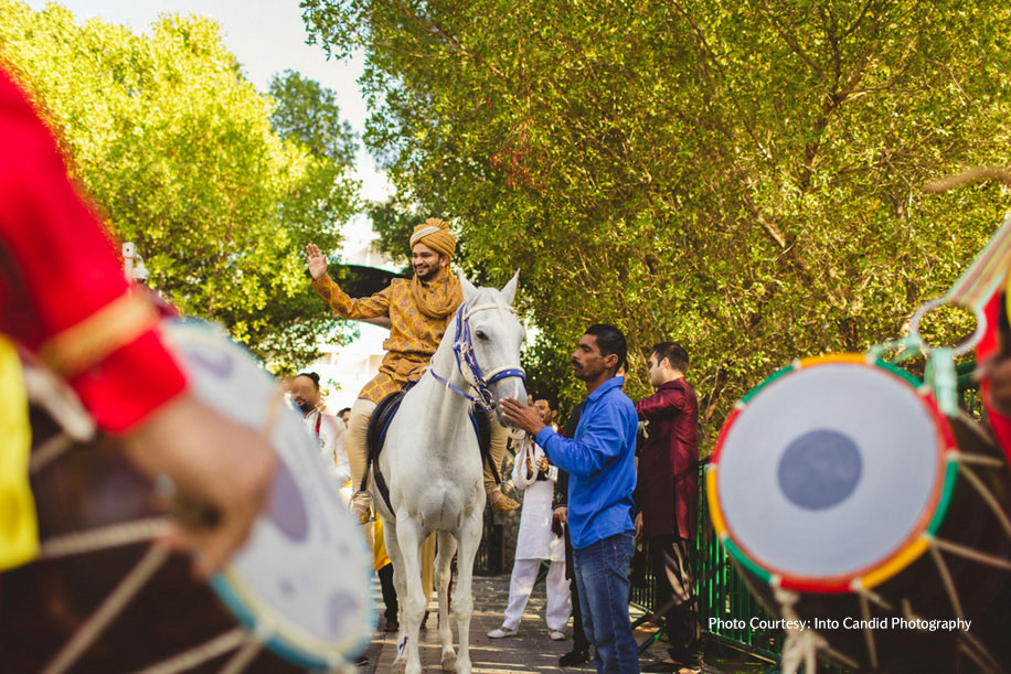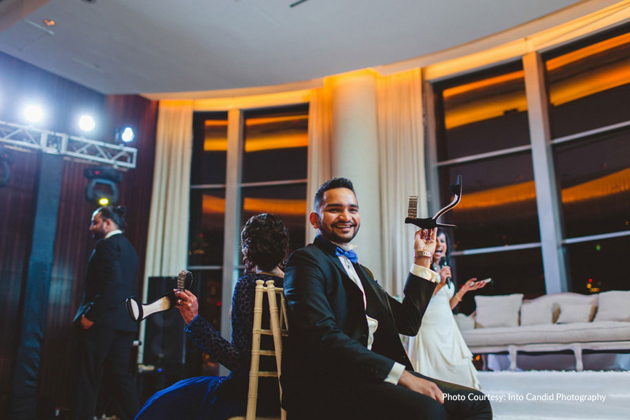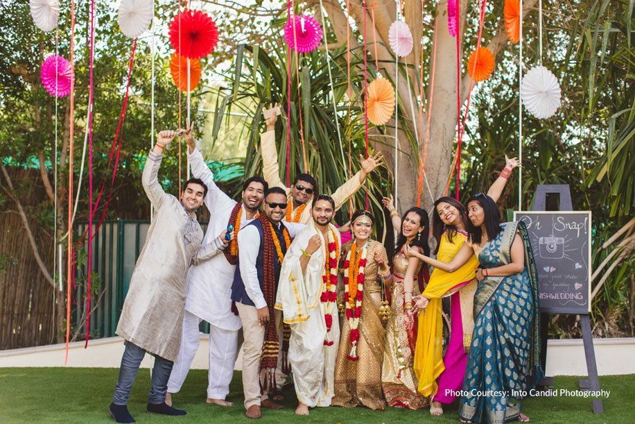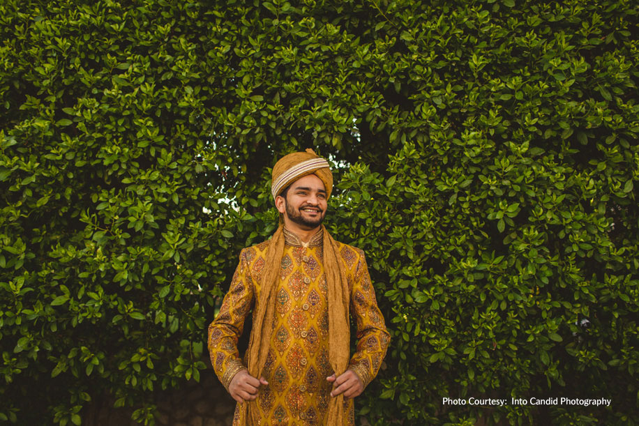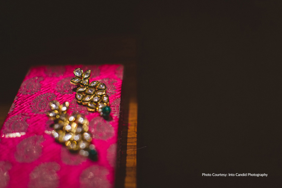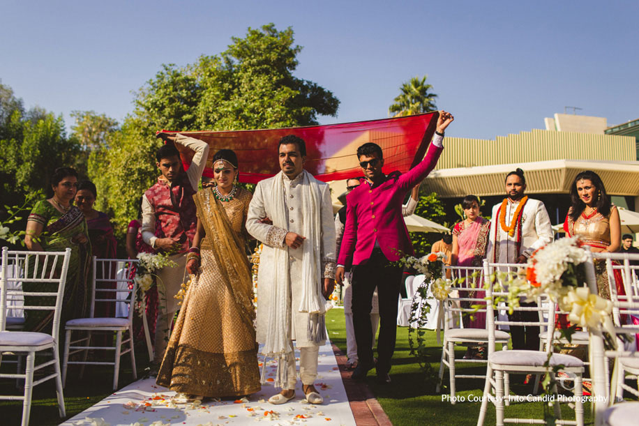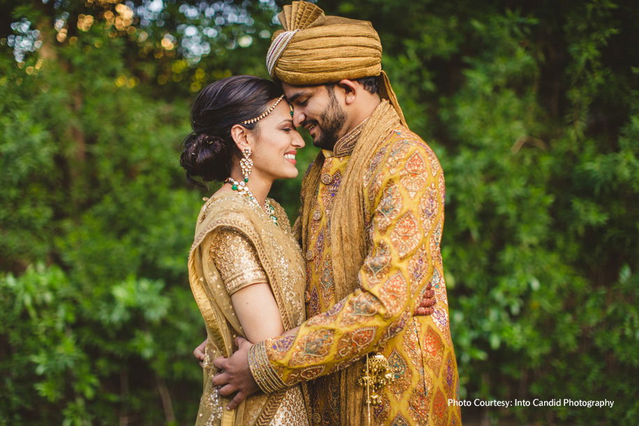 “The decor at our wedding was simple – I wanted it to be a mix of South and North traditions, but colorful at the same time. We picked beautiful marigold flowers for the all white mandap along with colorful carnations and brass bells. The photobooth was a mix of colorful ribbons, paper fans and a quirky cycle. The ceremony was a very traditional one and our decor was in sync with that aesthetic. I accessorized my gorgeous gold lehenga from Asiana Couture with a kundan necklace, a delicate ‘matha patti’ (forehead band) and earrings. I wanted my makeup to be subtle, and Nina was a blessing as she managed to make me look elegant that day. Satish looked equally handsome in his yellow sherwani as he made the grand entry driving a Bentley followed by a ‘baraat’ (groom’s procession).”