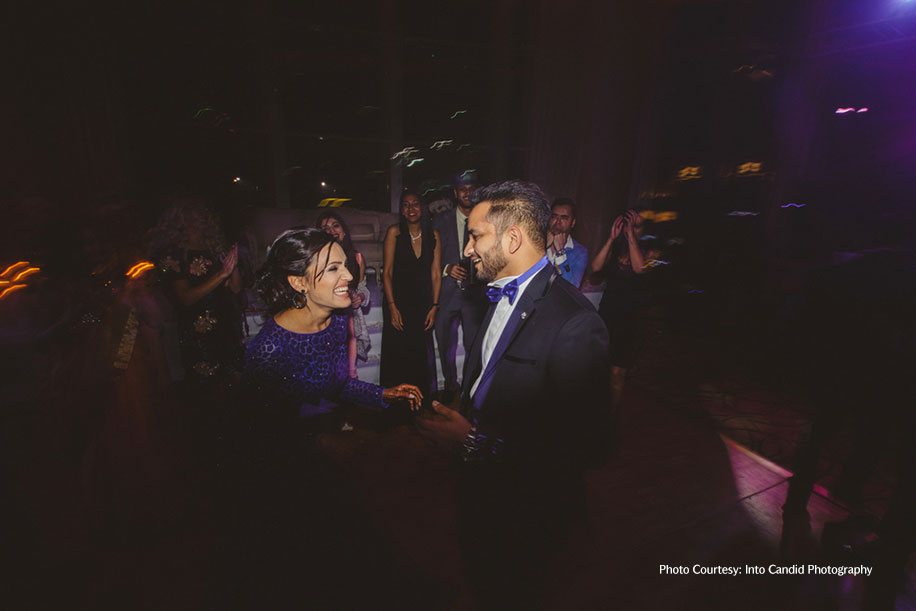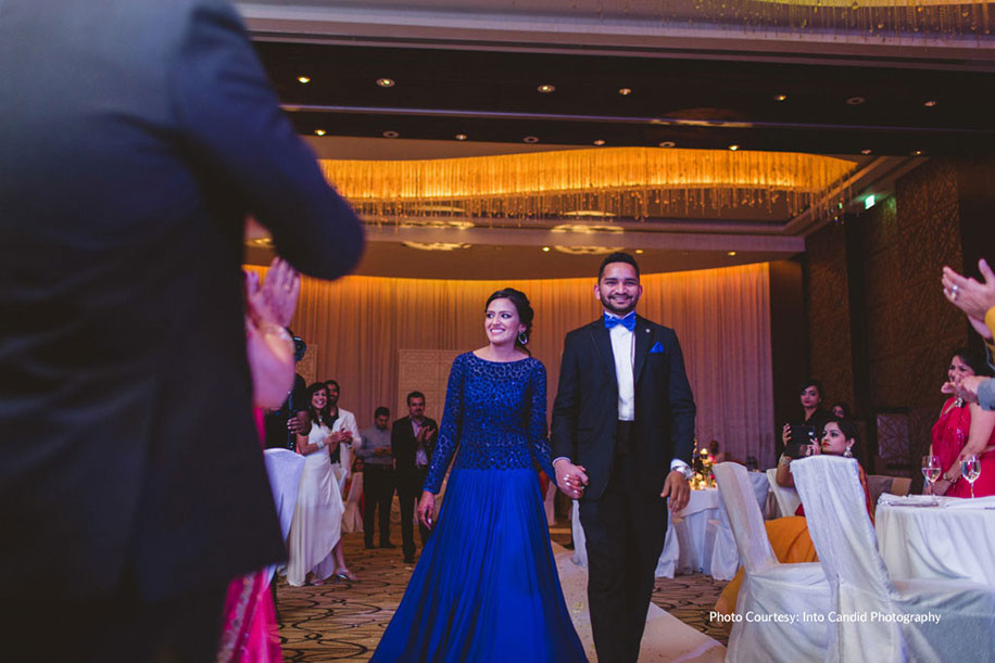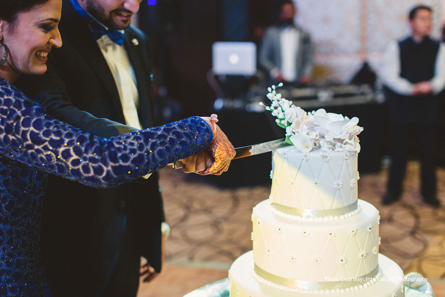 Tanvi wore a royal blue ensemble for the reception, and Satish opted for a classic black tuxedo, with a matching blue bow tie to match Tanvi’s outfit. The stage for the reception was lit with candles and white floral arrangements which matched the impressive three-tier cake.