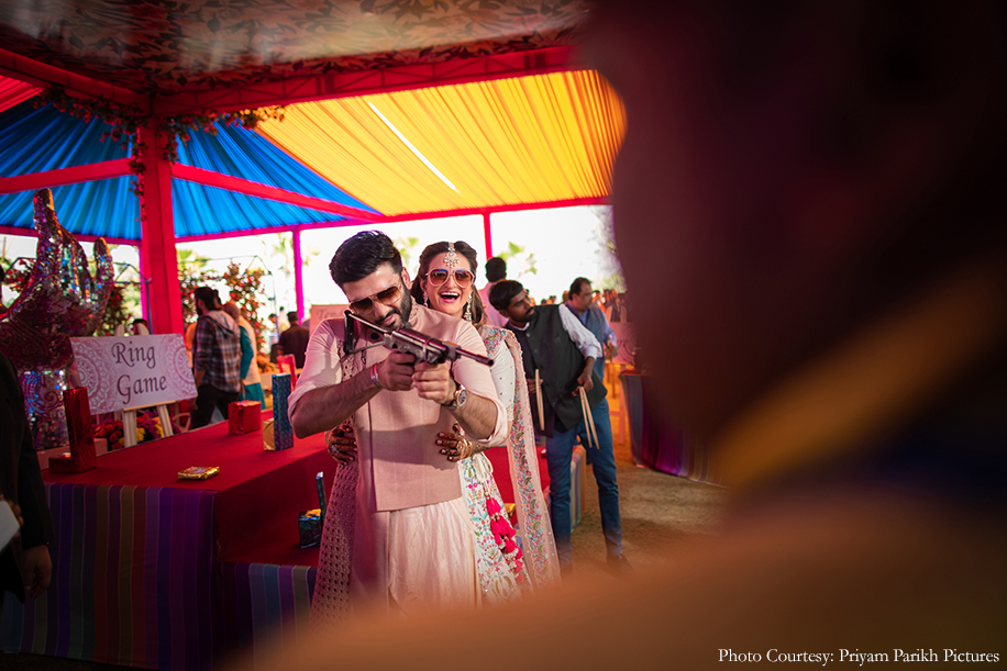For the bigger outdoor mehndi party, the couple picked white for the color palette, and even incorporated the color in their ensembles. As they posed against the rugged beauty of the Aravali hills, Tanya’s white lehenga with multicolor embroidery, and Kushal’s contemporary kurta contrasted with the sunlit sky, creating a picture-perfect moment. Being an outdoor affair, the couple’s guests enjoyed coolers to keep the heat at bay and entertained themselves at the carnival-like game stalls.