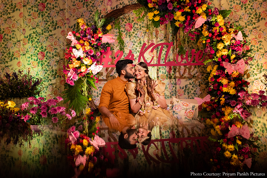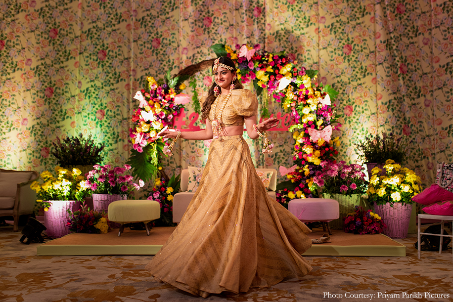 The indoor bridal mehndi was a colorful affair with a floral backdrop that had #24KTLOVE written on it. Going in sync with the decor was the bride’s floral jewellery as she got henna patterns done on her hands. Tanya’s lehenga was of a subtle yellow hue, and had puffed sleeves and delicate sequins that reflected the soft golden lights. Kushal chose a mustard yellow kurta with an ornate brooch for the occasion and set the stage on fire with his performance.