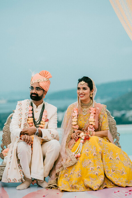 “Ours was a sunset wedding, and that was all I was sure about when we started planning the wedding. As a photographer, I was adamant on having natural light for the pheras because it looks beautiful in pictures and real life as well. We went for a peach mandap with pink, white and peach flowers which matched my turmeric yellow lehenga and Divyanshu went for an off-white sherwani with a peach turban.”