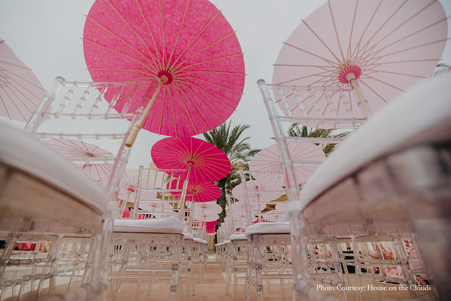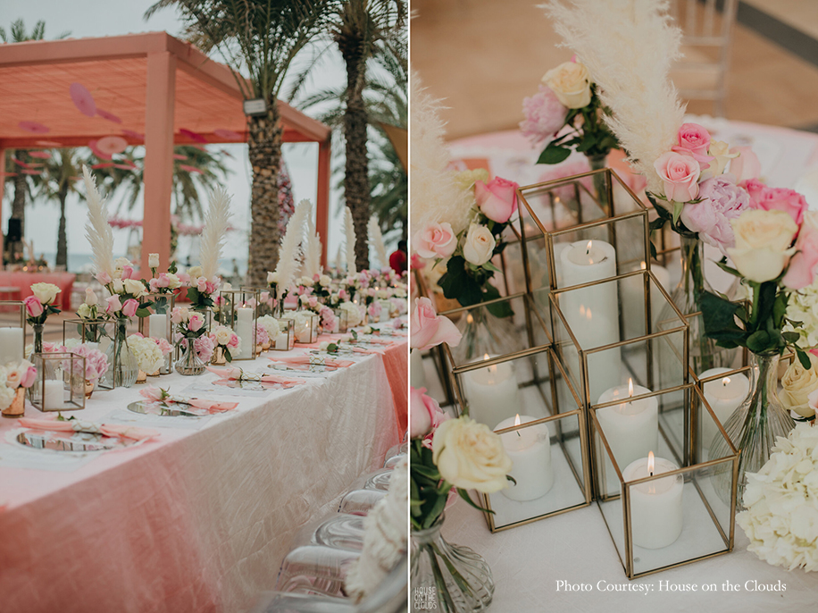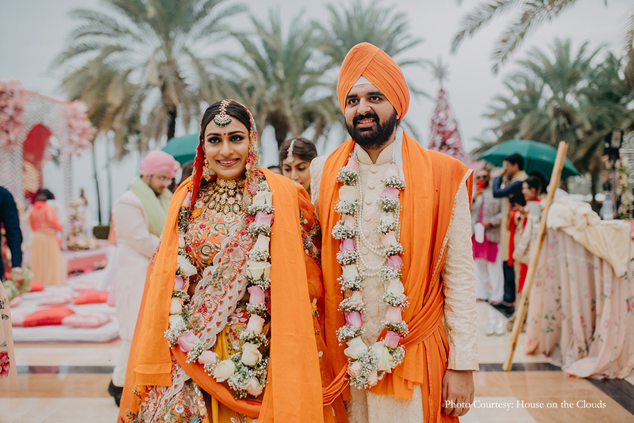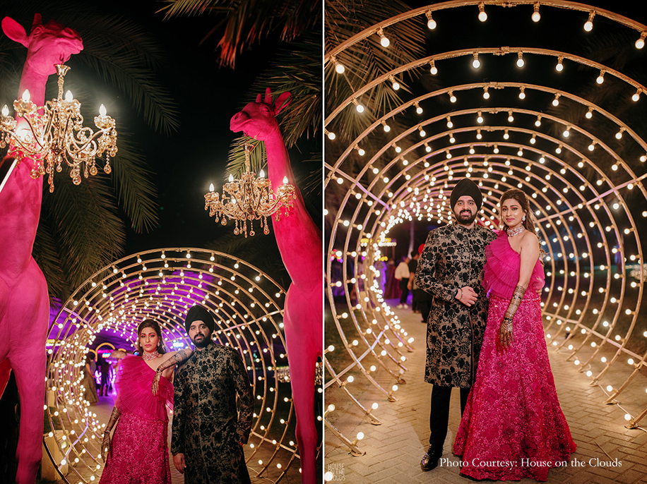 The outdoor wedding ceremony exuded an enchanting fairytale-like vibe in shades of pink, incorporating 6 distinct shades of salmon, coral, blush, magenta, baby pink, flamingo. Floral covered trellises and exquisite table settings set the mood for decor that was chic and refined. The day was full of poignant moments of love and emotions. The couple looked sensational in coordinating outfits featuring peach and mandarin hues. The groom wore a creamy peach sherwani from Vanshik with a sunny turban and stole, while the bride wore a floral lehenga in citrus tones from Anamika Khanna, which she paired with jewellery from Rajwada Jewels.