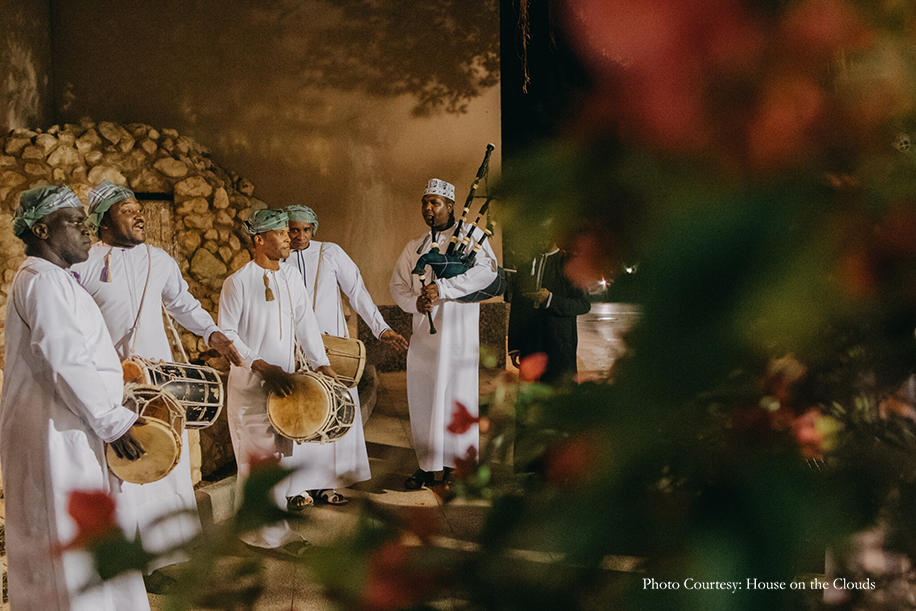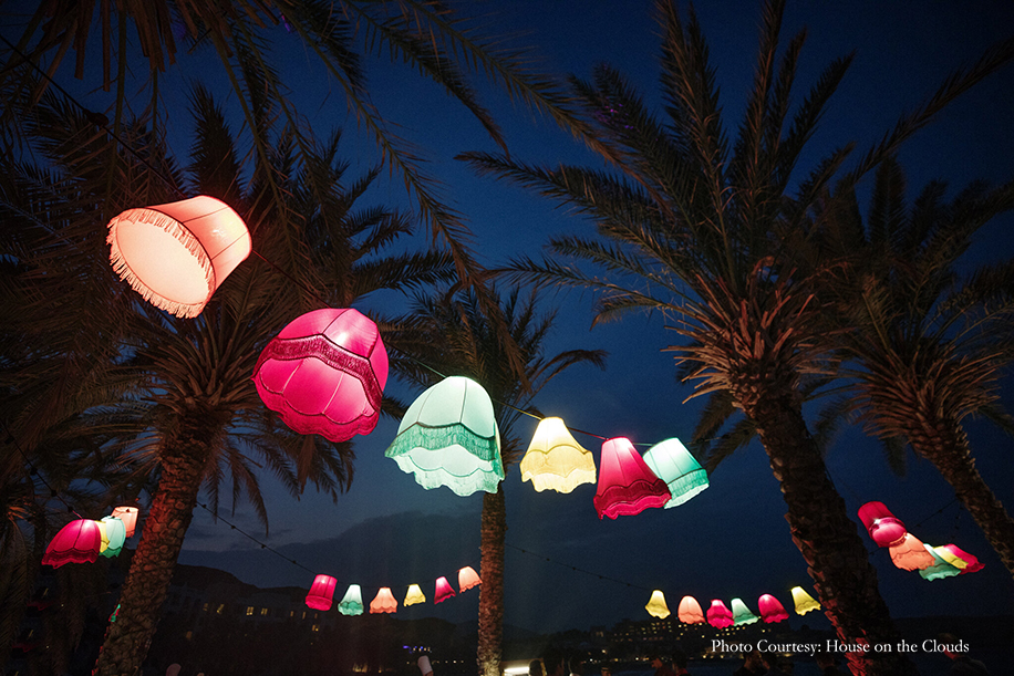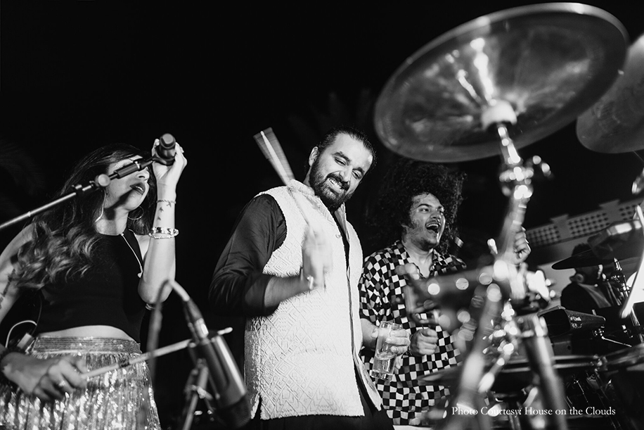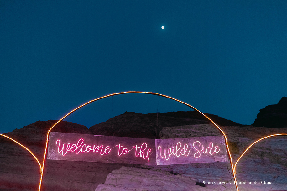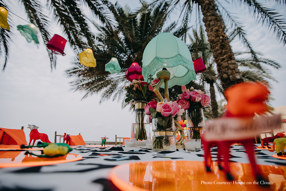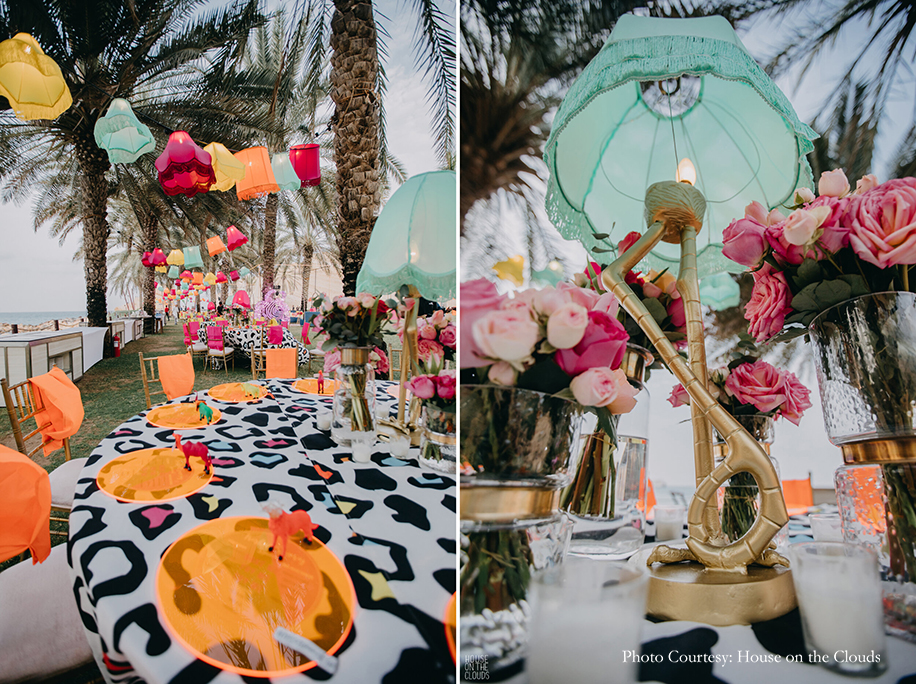 The first night of the festivities commenced with an ‘Arabian Night’ that was created to transport guests to a charming and rustic Arabian village. Authentic Omani bakers serving traditional breads, stalls with traditional handicrafts and camels added an enchanting Arabic flair to the event. It was a night of spirited music and dancing as everyone hit the dance floor to the beats of the Chicken Masala band. The bride wore a colorful skirt ensemble from Papa Don’t Preach by Shubhika, while the groom opted for a kurta with bandi jacket from Kunal Rawal.