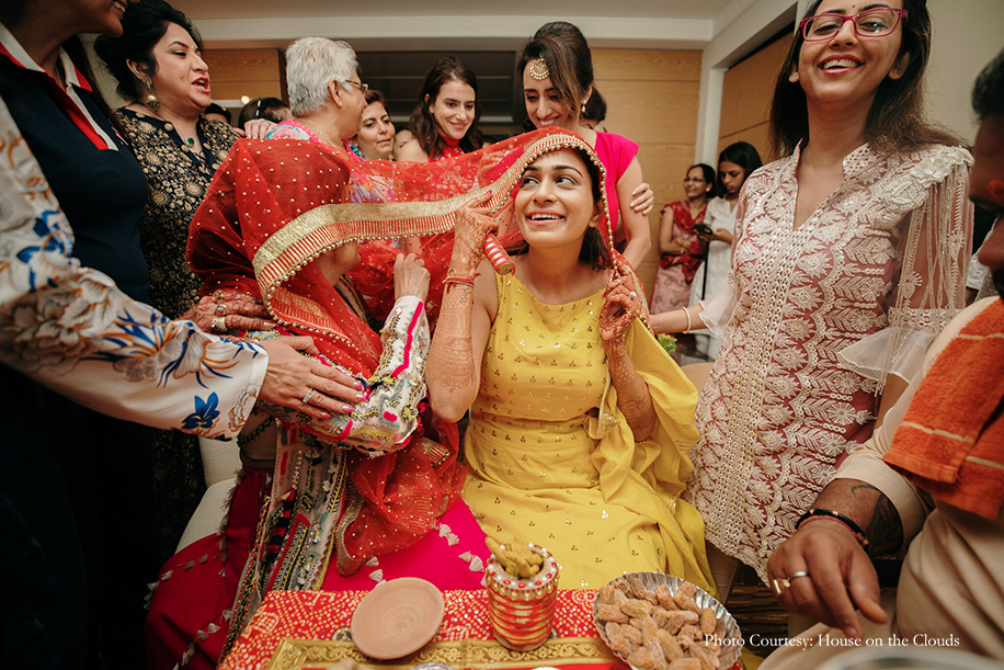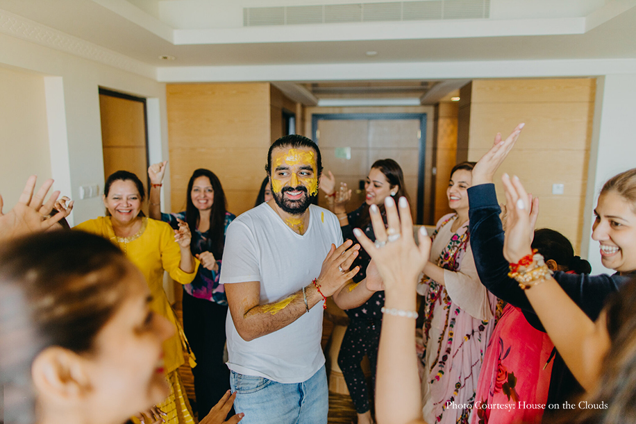 The final day dawned with the haldi ceremony for the groom where he was smeared with turmeric paste by his family, while the bride had her ‘chooda’ (bridal bangles) ceremony with her family. She kept her look simple and elegant in a yellow Sukriti and Akriti Kurta.