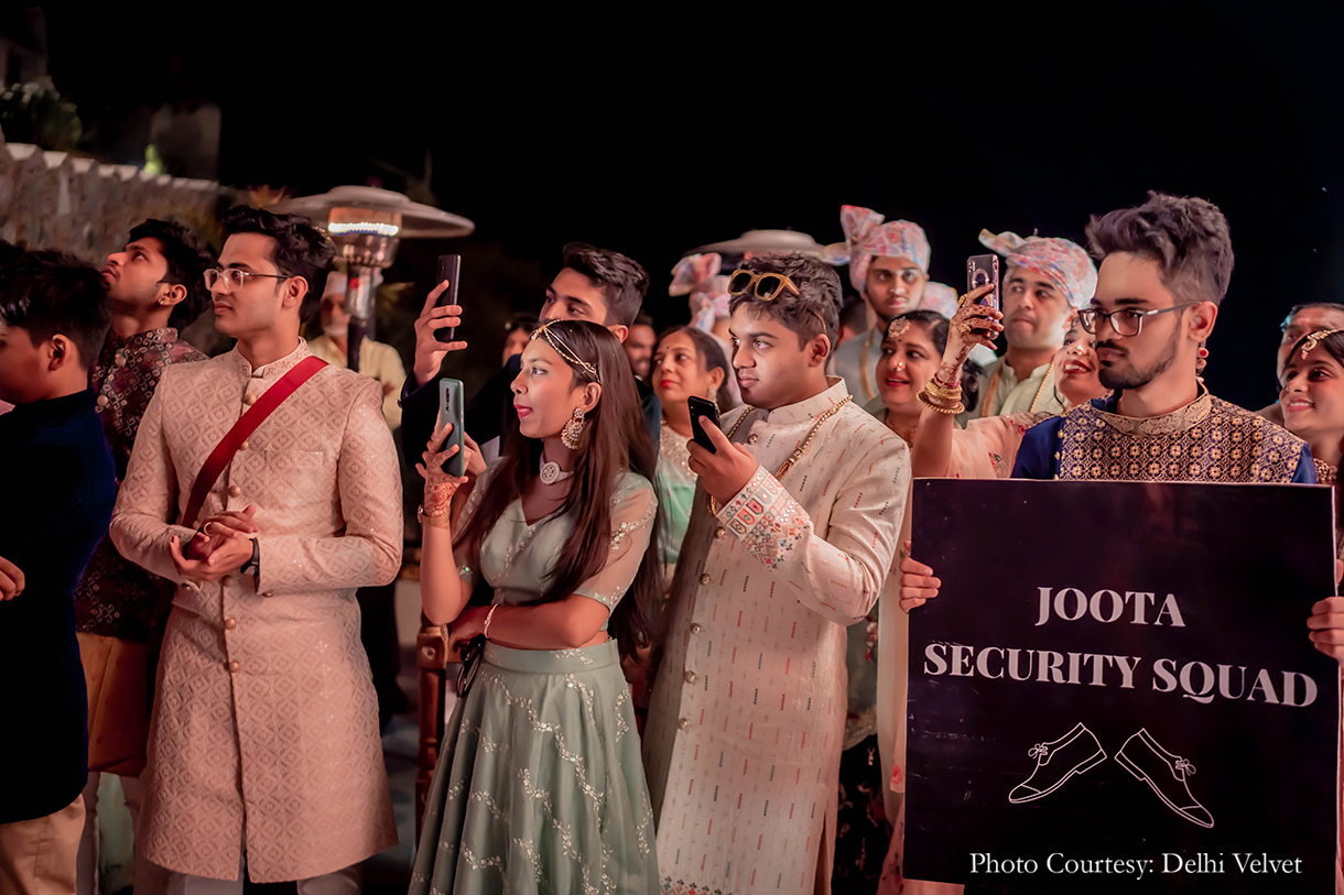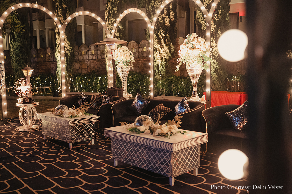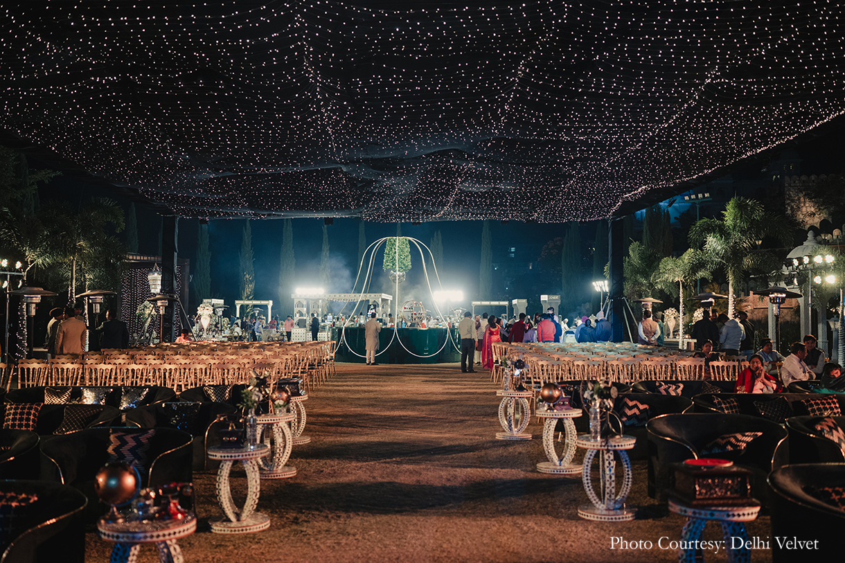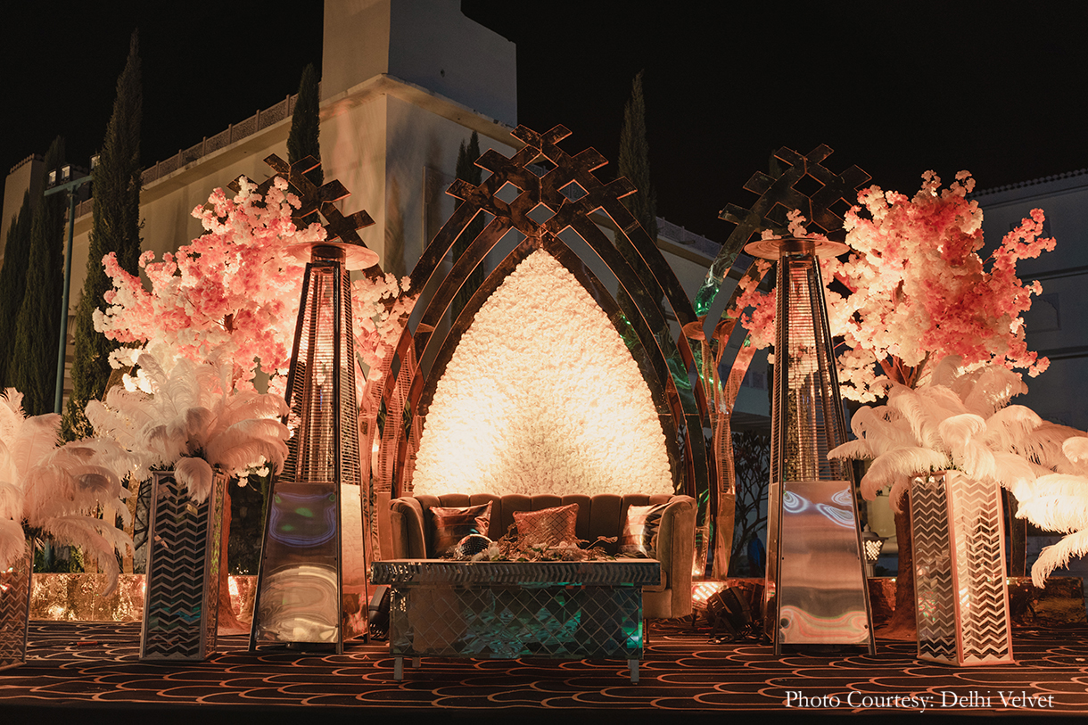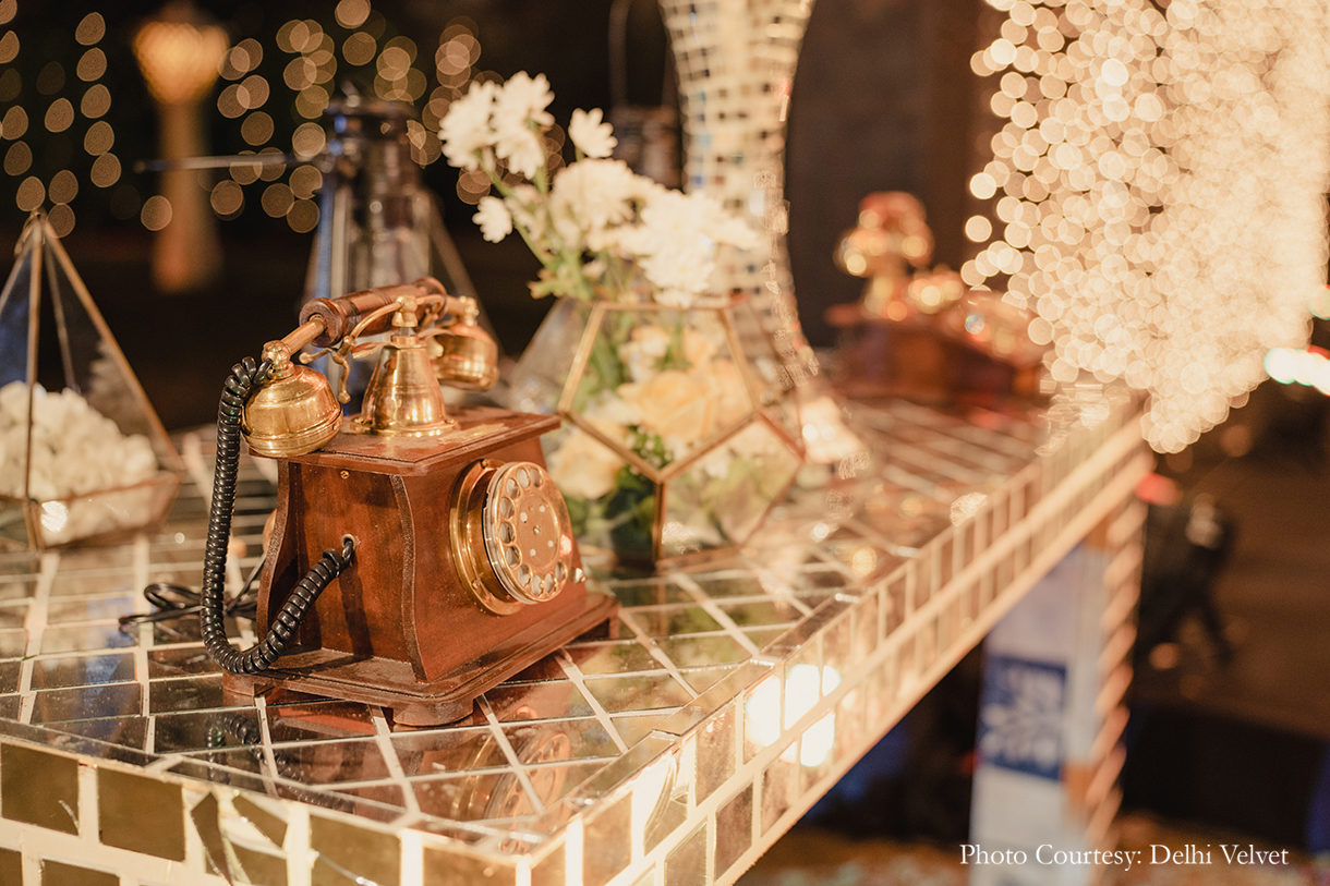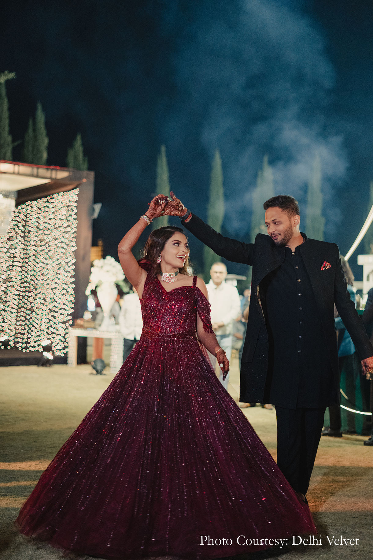 A starry night of music and merriment, the Sangeet function saw a decor theme of ‘vintage meets edgy glamor’ that set the perfect tone for the high-octane festivities. Antique memorabilia, sleek mirrored elements, rich evening hues, and more came together in a decadent confluence of art under a canopy of shimmering fairy lights. Rousing family performances lit up the stage as everyone cheered and had the time of their lives.