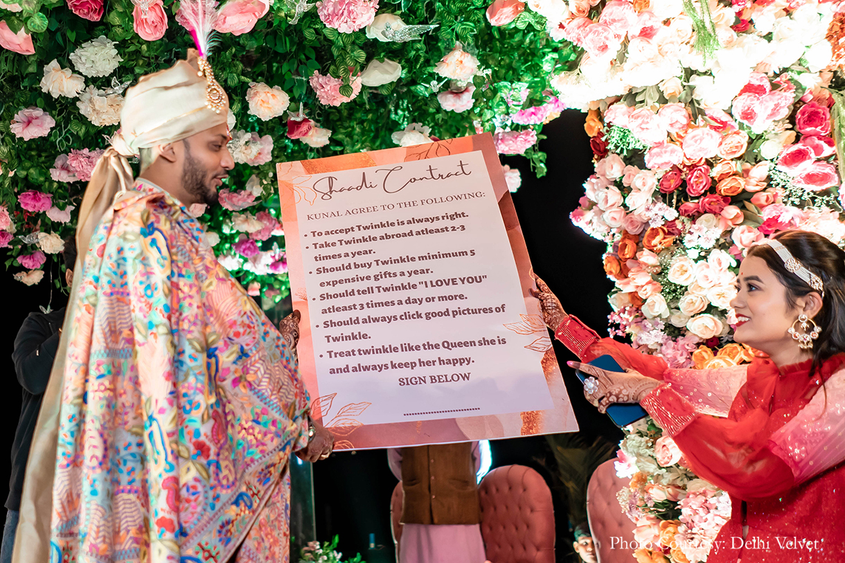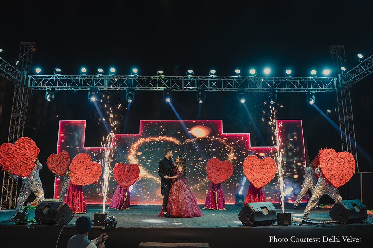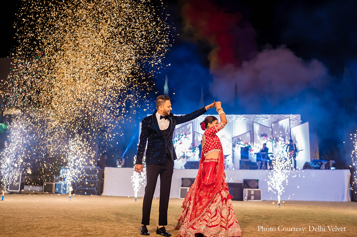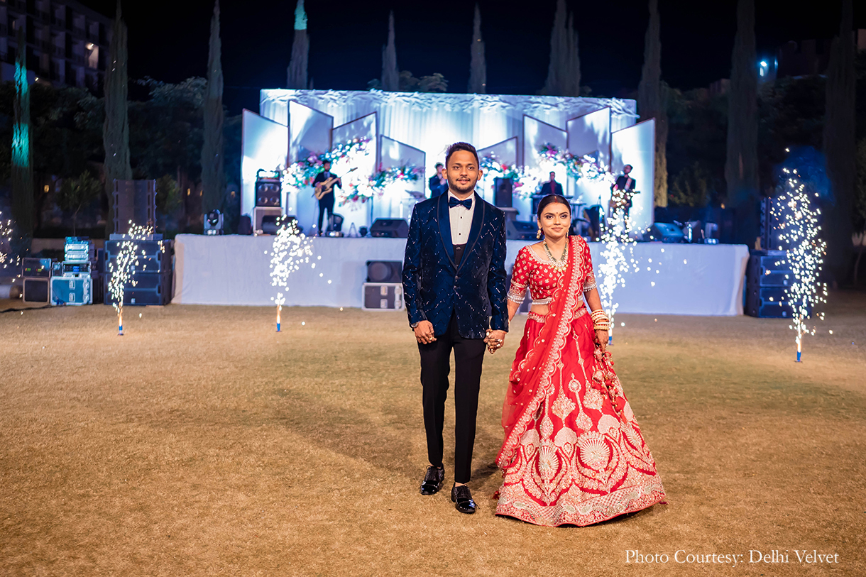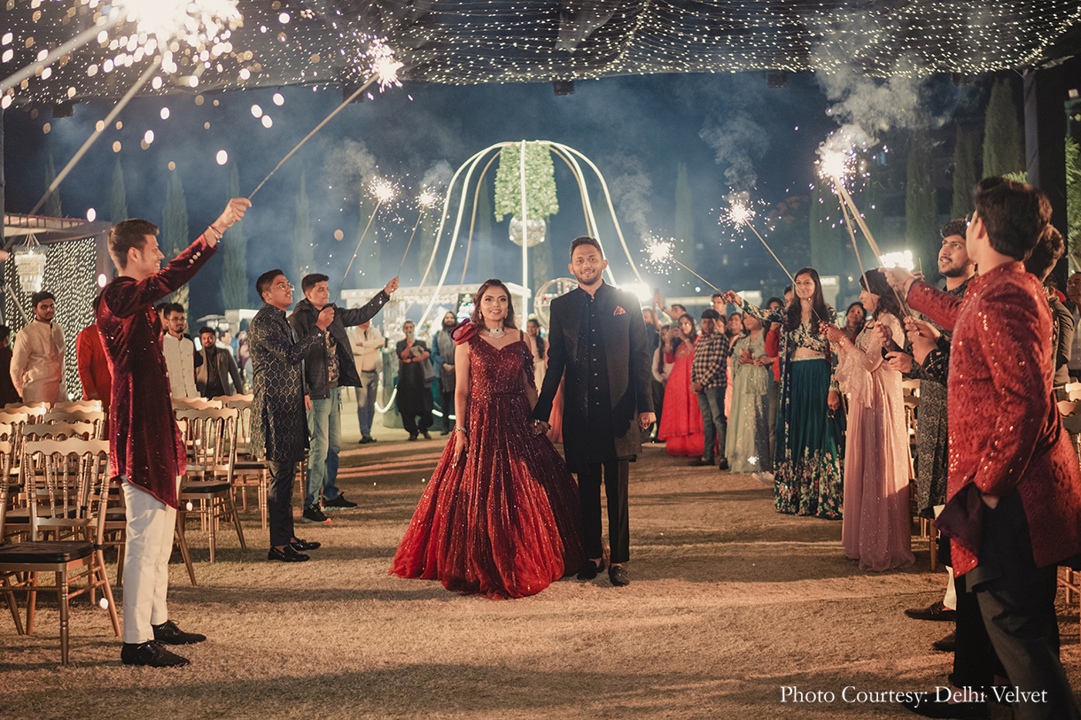 The ceremony was followed by a formal reception dinner. Elegant floral arrangements, chandeliers, scalloped drapes, and more set a classy tone for the occasion. Swapping out their pastel outfits for a riveting red lehenga and tuxedo respectively, the bride and groom made a stunning entrance amidst sparklers and fireworks and spent the evening enjoying themselves with their loved ones.