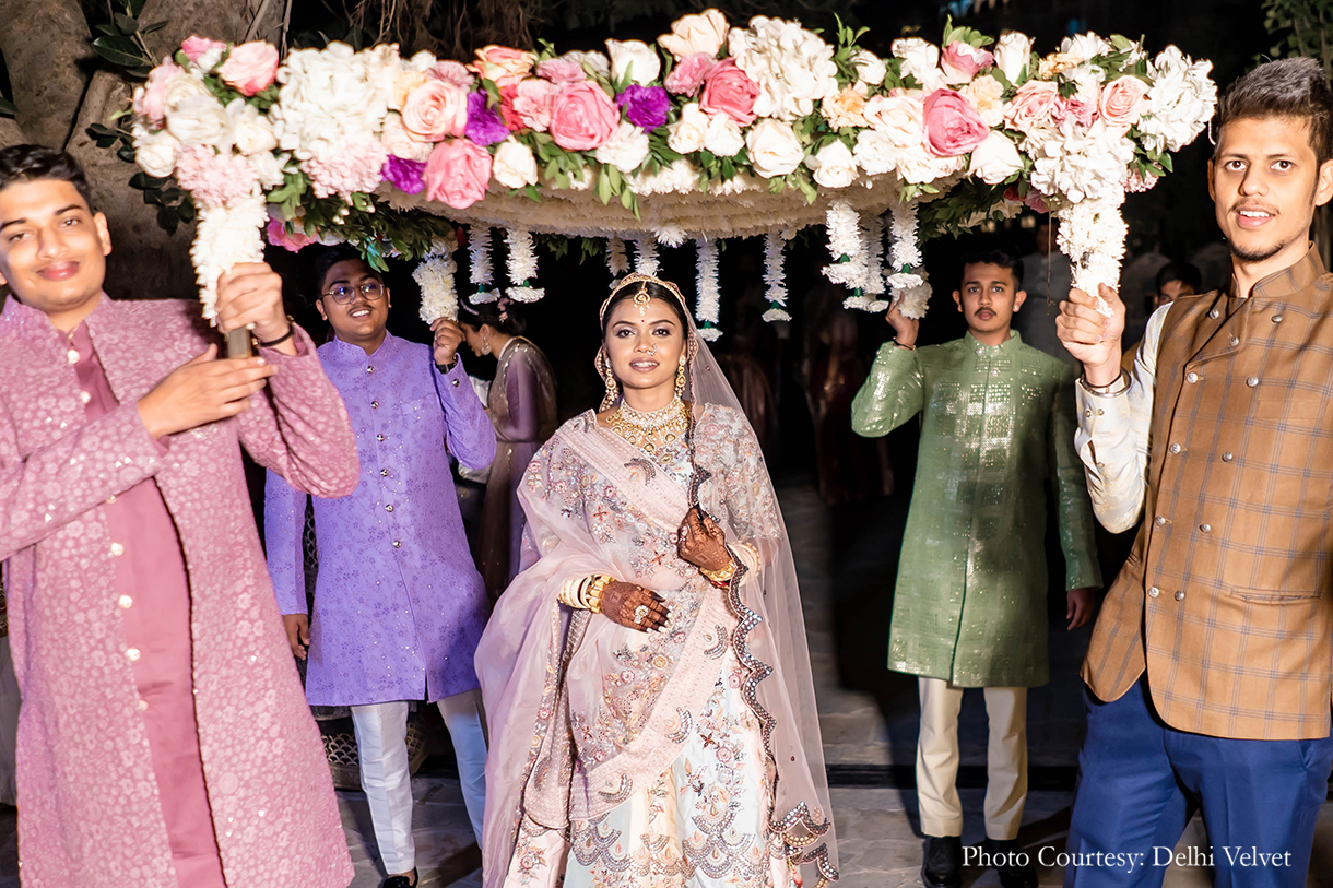 The wedding ceremony was a floral extravaganza, woven with tender moments of love and emotions. Dressed in soft peach embroidered ensembles, the bride and groom exchanged garlands under a magical canopy of blooms before taking their vows amidst the blessings of their loved ones.