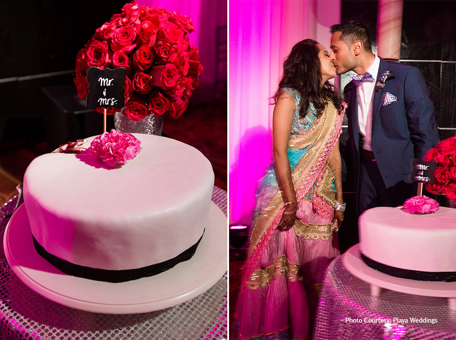 “Our reception was planned outdoors with red paper lanterns and strings of lights as the decor elements. However, due to the weather, we moved the event indoors to an air-conditioned venue. We wrapped ‘dandiyas’ (Gujarati dance sticks) as favors and had a mix of Gujarati and North Indian dinner menu. The menu and the table numbers that we had were printed in Gujarati. During the cocktail hour, guests were handed glasses with their names and straws along with their respective table numbers. Tejas wore a black suit with a bow tie, and I wore a pink and blue lehenga.”
