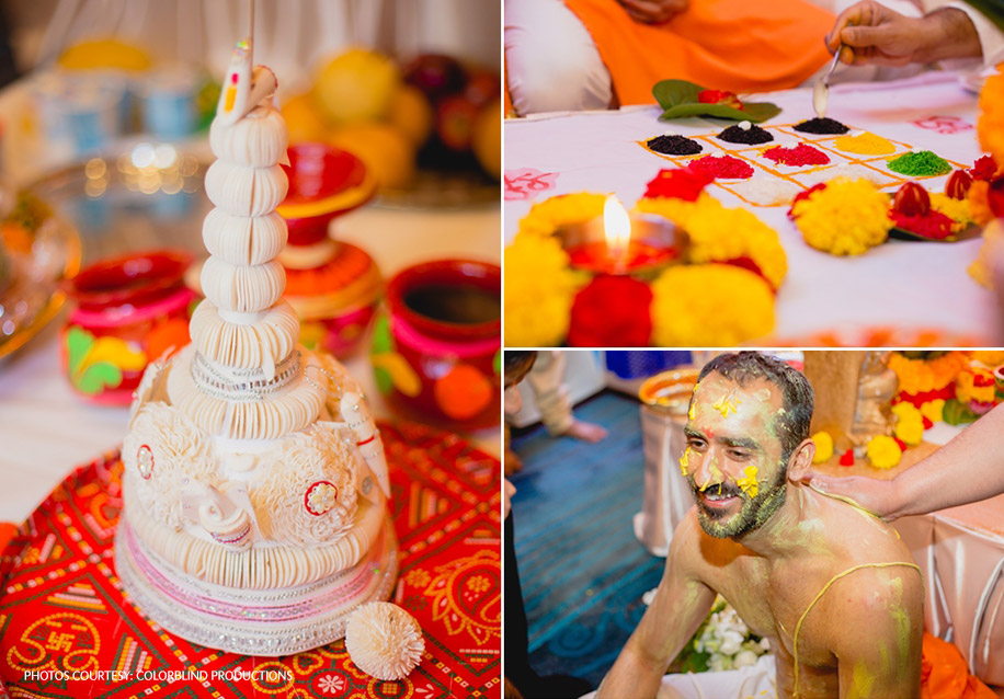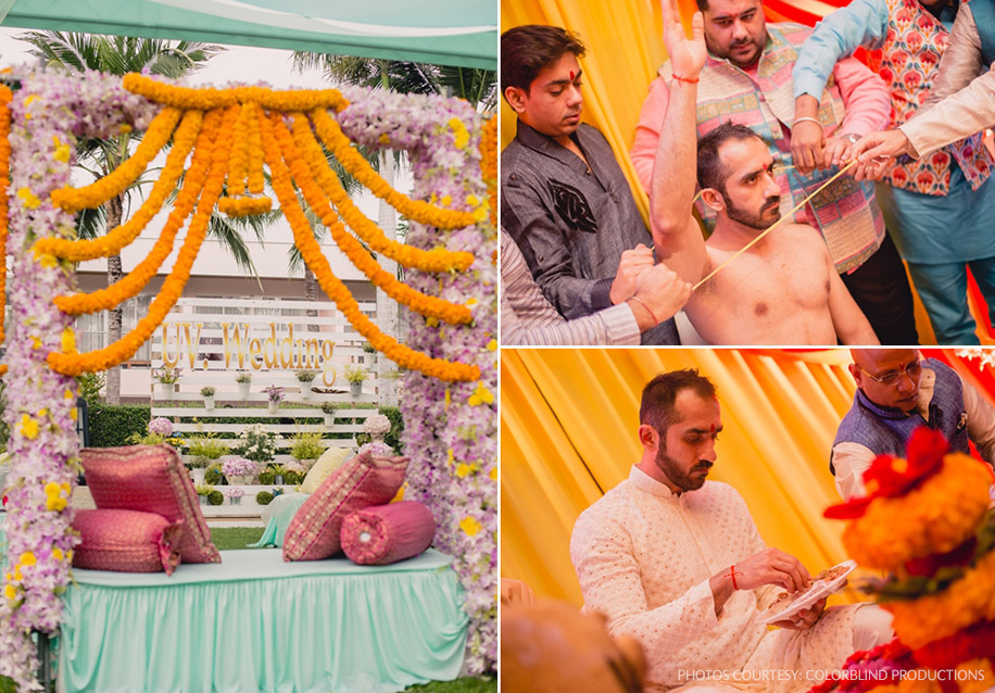 “I honestly don’t know how Vishal made it to his ‘Janya’ (thread) ceremony looking so fresh after having just slept for just a few hours. I remember waking up that morning feeling very excited to get my mehndi done. However, we faced some rains in the afternoon and had to shift the party indoors, but it just added to the fun of getting into the pool. I wore a customized Mahima Mahajan outfit which included a glittery pale yellow blouse with intricate gold thread work which was paired with a draped deep pink tulip hi-low skirt. I was able to show off the mehndi designs on my feet in this dress. I loved the yellow dupatta with tassels, which was my favorite part of this ensemble! I accessorized my look with statement earrings and a ‘jhumar’ ( a traditional ornament worn on one side of the head).”