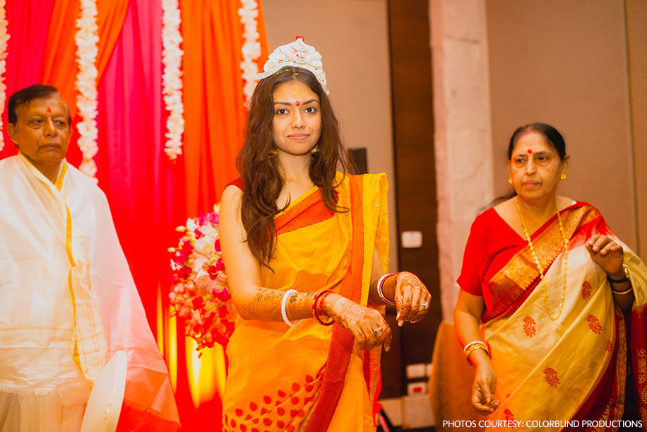 “For my haldi ceremony, I wore a traditional Bengali cotton saree with ‘jhumkas’ (ethnic earrings) and was made to wear the Bengali bridal tiara for the first time. After my haldi shower, I applied ‘alta’, (A red dye applied on a bride in Bengali weddings) to adorn my hands and feet to get ready for the wedding.”