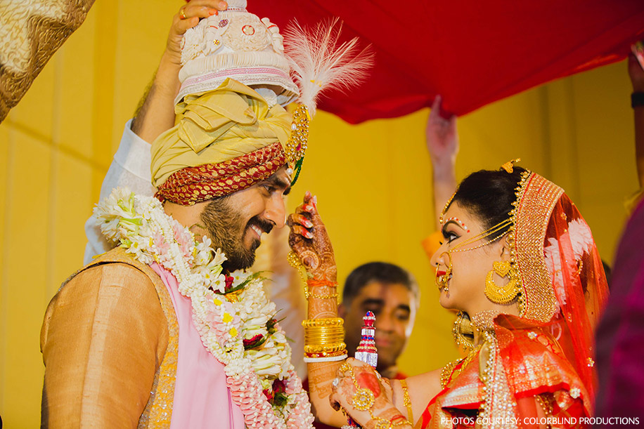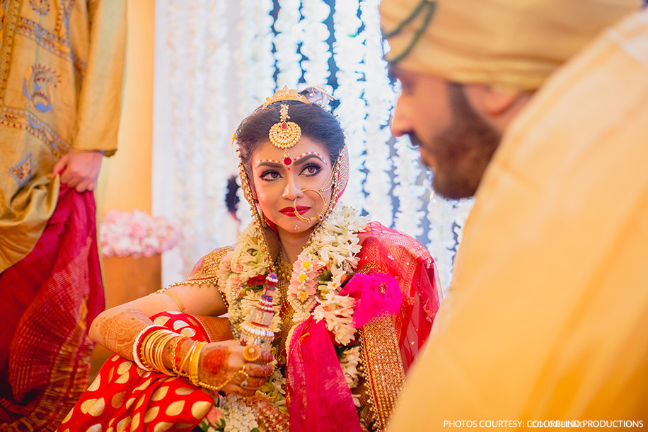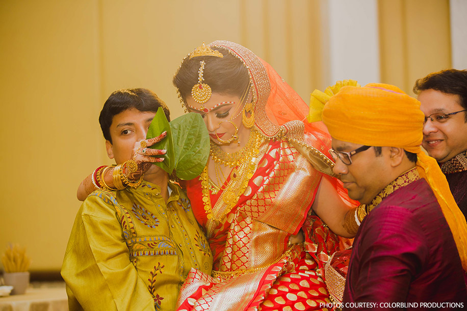 “The big day was finally here! I had a Dodhi Mongol puja (Bengali wedding ritual) at 6 am where I was given a beautifully embellished ‘Gach Kouto’ (a pot containing vermillion powder and a silver coin) from Kolkata, which is a traditional Bengali bride’s accessory, I had to hold this in my hands throughout the ceremony. It started raining again, so we had to set up our mandap indoors. Our planners did an amazing job at managing this last minute hiccup. For the wedding ceremony, I was carried by my brothers to the wedding altar. I covered my face with betel leaves and was taken around Vishal seven times before I let him see me – although Vishal does say that he’d managed to get a peek of me before the event. Seeing each other for the first time that day, in all our grandeur, was a surreal feeling. All that mattered was that we got married while being surrounded and blessed by our family and friends who are the closest to our hearts. We both chose to wear traditional Bengali bridal outfits for this ceremony. Vishal wore a customized tussar silk dhoti with a bandh gala jacket and a matching turban, while I wore a bright red Benarasi silk sari with traditional gold and uncut diamond jewellery.”