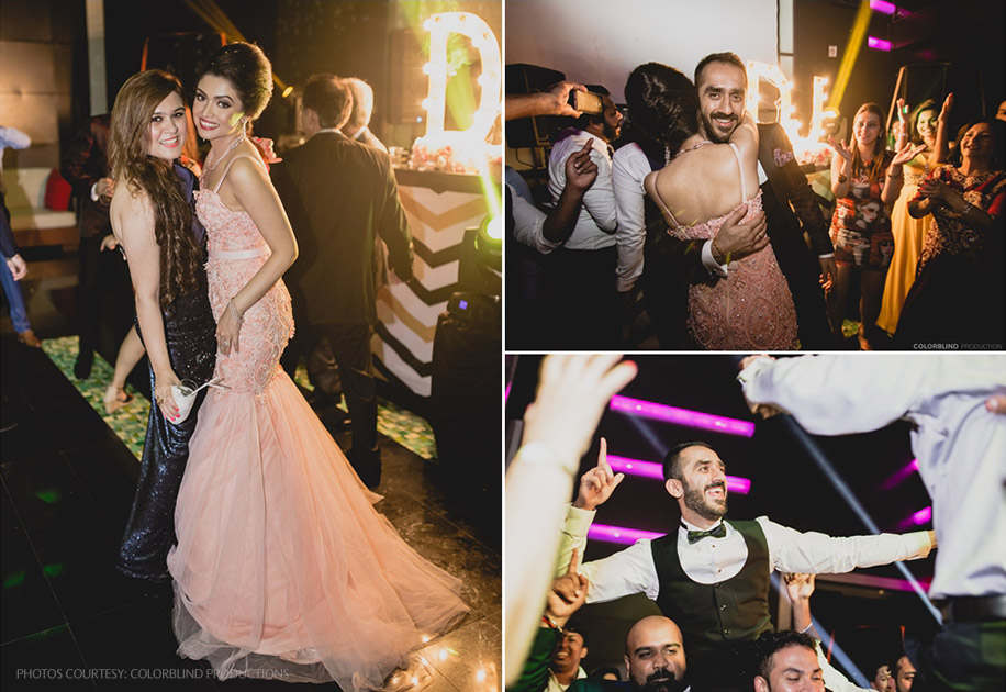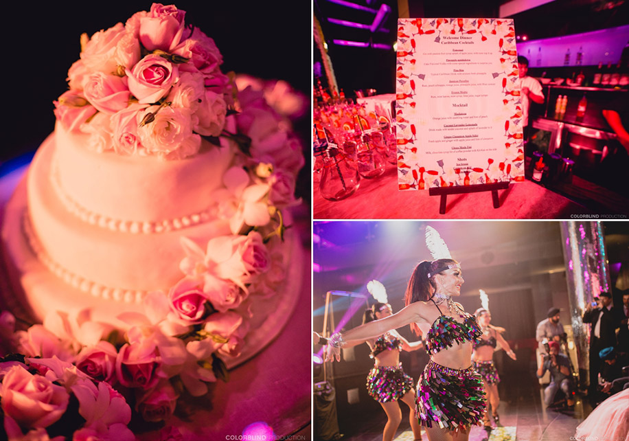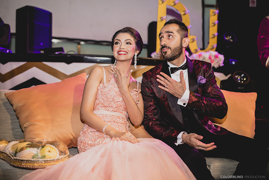 “We held the engagement night at the resort’s in-house discotheque ‘Black’ as we knew that we’d be partying till the wee hours of the morning. The event had a samba theme, and we had exotic samba dancers and Caribbean cocktails which set the mood for rest of the evening. I wore a bejeweled peach Swarovski mermaid dress that I got custom-made by Dar Sara Fashions in Dubai and paired it with diamond earrings and bracelet. Vishal wore a customized tuxedo which matched my look perfectly.”