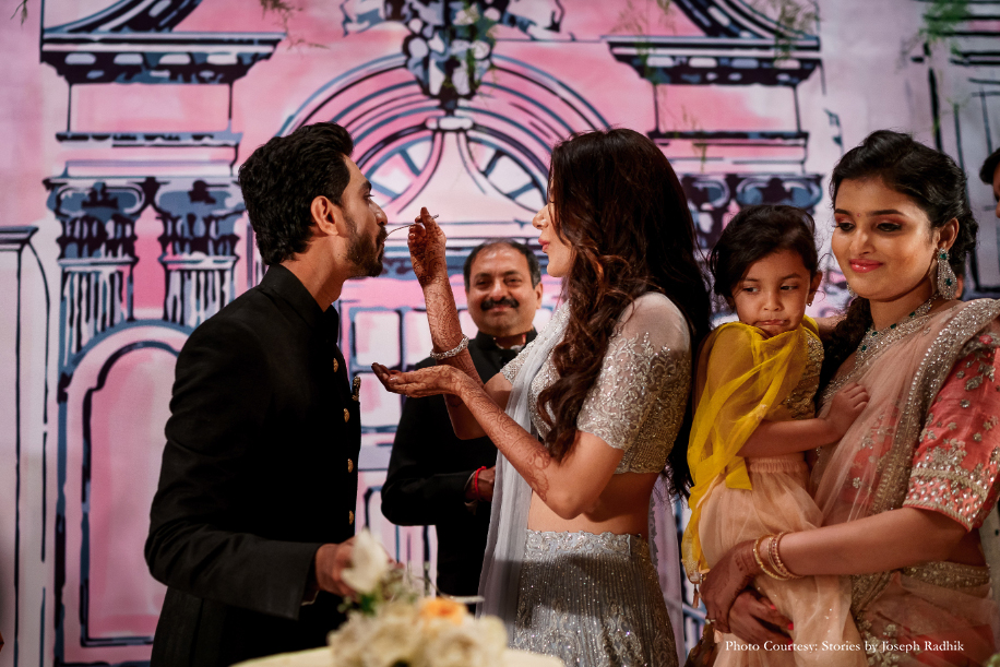 “We hosted our first reception at Hyderabad, for which I wore a feathered outfit by Falguni Shane Peacock. With massive chandeliers, elaborate drapes and elegant centrepieces, the décor for the evening amazed with a royal and glamorous touch.”