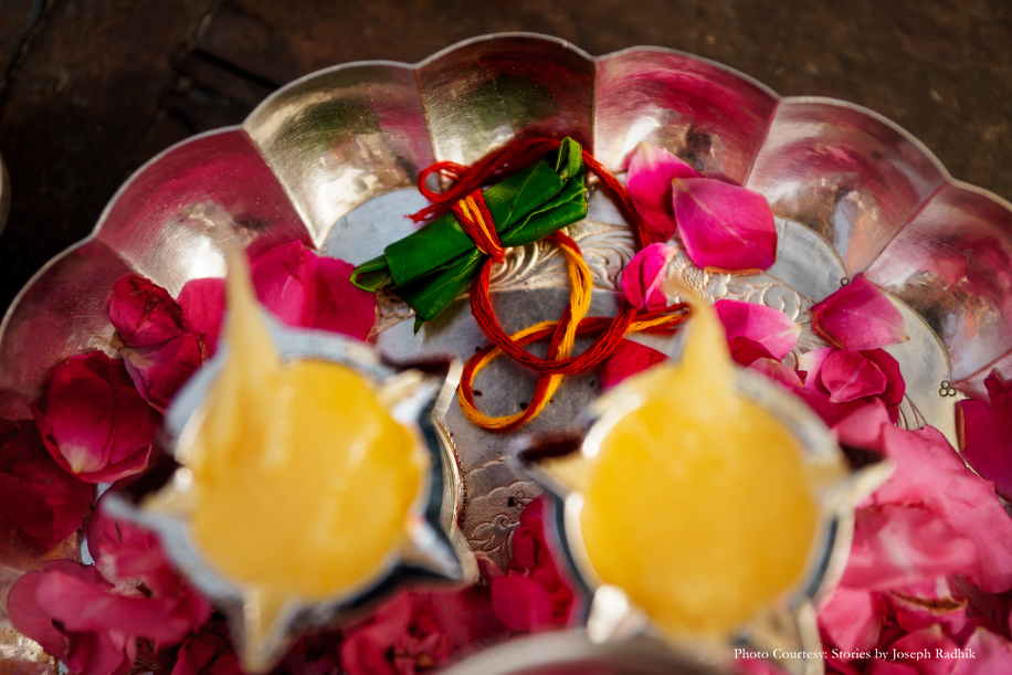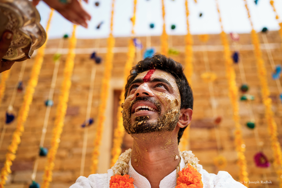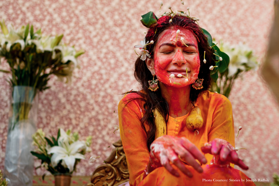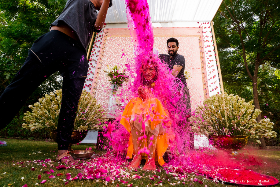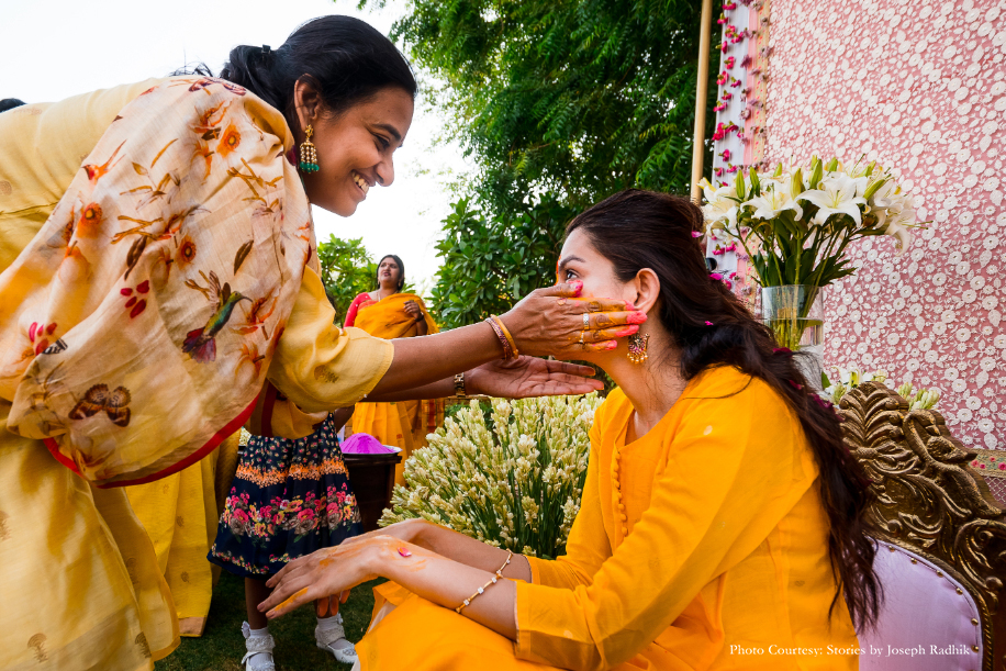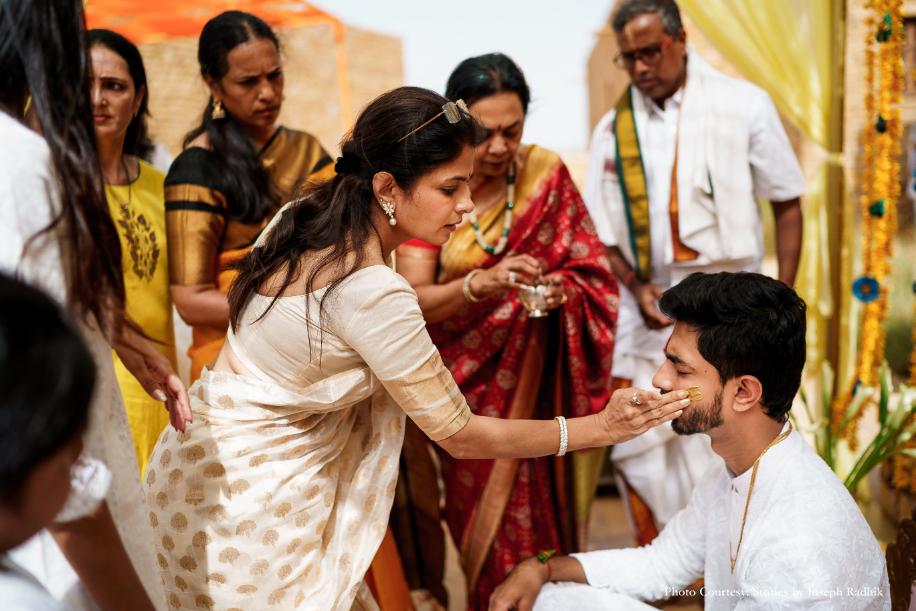 “We hosted our haldi ceremony on the next day, which was then followed by ‘nalugu’ (traditional Telugu wedding ritual where a couple is smeared with turmeric and oils), during which Rohit and I sought blessings from the elders. Going with the theme of the ceremony, ‘Textiles of India,’ I wore a Raw Mango Banarasi lehenga for this ceremony, and Rohit chose a kurta by Kunal Rawal.”