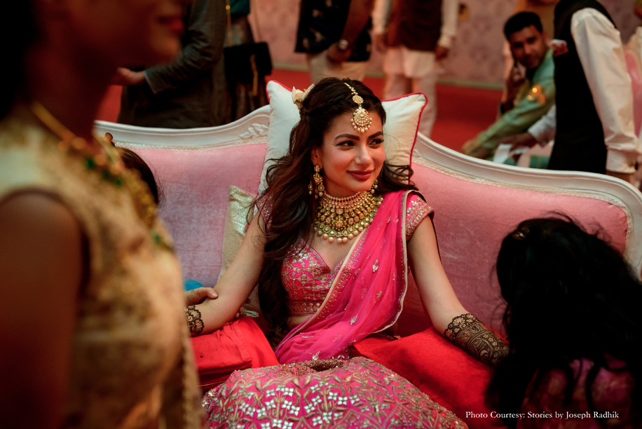 Jewellery: Farah Khan Fine Jewellery (Earrings- -Brunch, Sangeet), Sabyasachi Mukherjee (Necklace – Sangeet, Maang Tikka – Nalugu, Mehndi,Wedding, Reception 2), Jaipur Gems (Bangles – Nalugu), Amrapali (Nalugu)