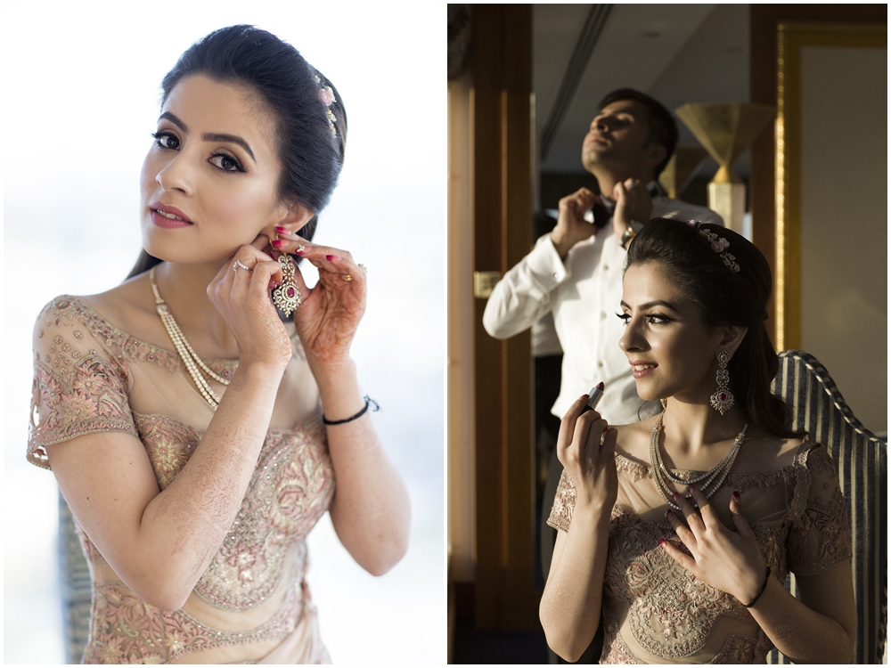 Her hair was tied back in soft waves; makeup kept to the minimum with just a touch of blush and some gold highlighter to accentuate her cheekbones and also to bring out her natural bridal glow.