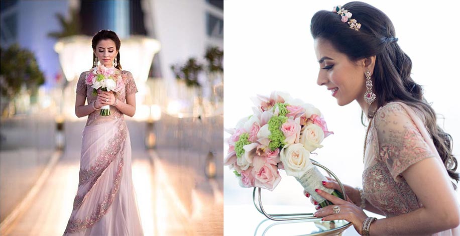 Shruti chose a wonderful Indo-western inspired saree-gown in pale pink from Hazar Haute Couture. Her heavily embellished attire was accessorized with a stunning necklace and chandelier earrings from Aljazz jewellery. She wore her favorite pair of Manolo Blahnik heels to complete her entire look.