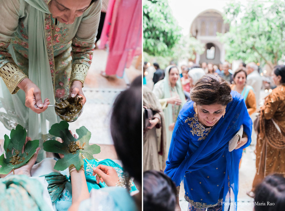 Zoha and Adil’s wedding was preceded by a mehndi ceremony which took place inside the stunning Riad Boumliha. The bride wore a monochrome kurta and sharara in the shades of blue, enhanced with delicate silver embroidery. The groom, on the other hand, opted for a kurta and patiala which he paired with a blue dupatta to complement Zoha’s outfit. The function was replete with song and dance which created a festive mood at the venue. The decor was kept minimal and colorful cushions and Moroccan lamps were the key elements in the setup.