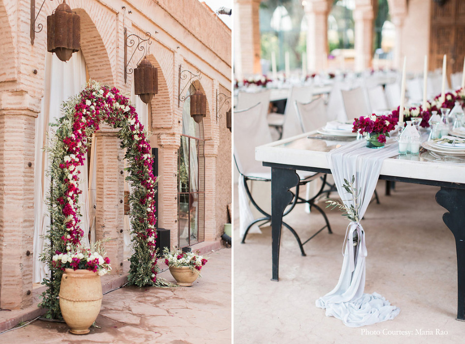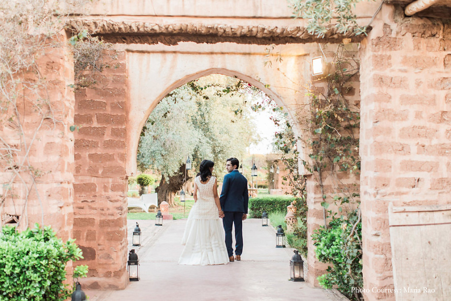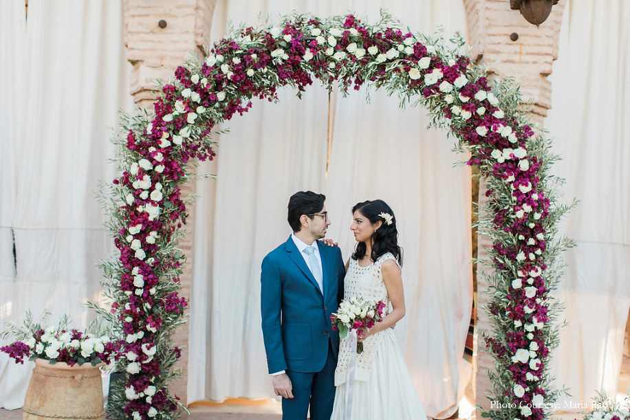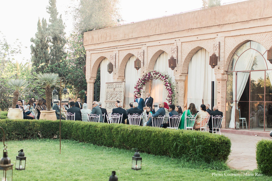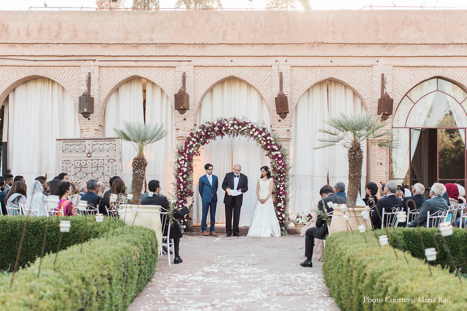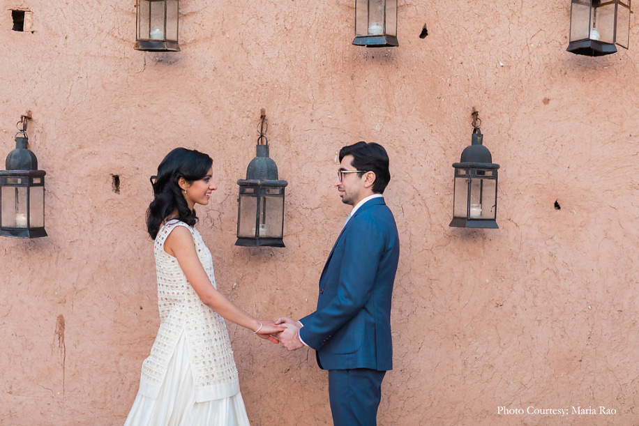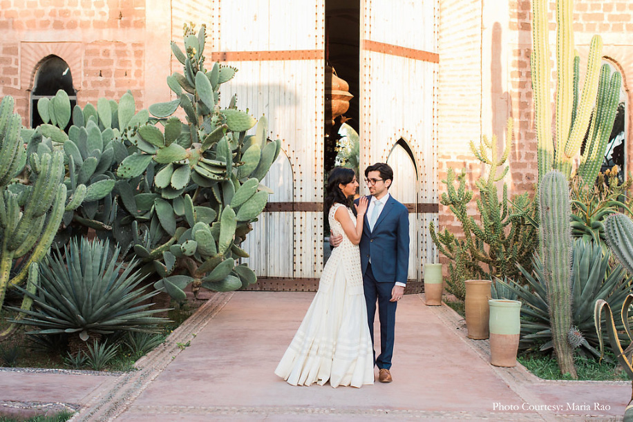The couple wed in a ceremony at the Beldi Country Club, exchanging vows by day, against an arch created using olive branches, bright pink bougainvillaea and white roses. While the bride wore a voluminous white lehenga, the groom opted for a well-fitted blue suit.