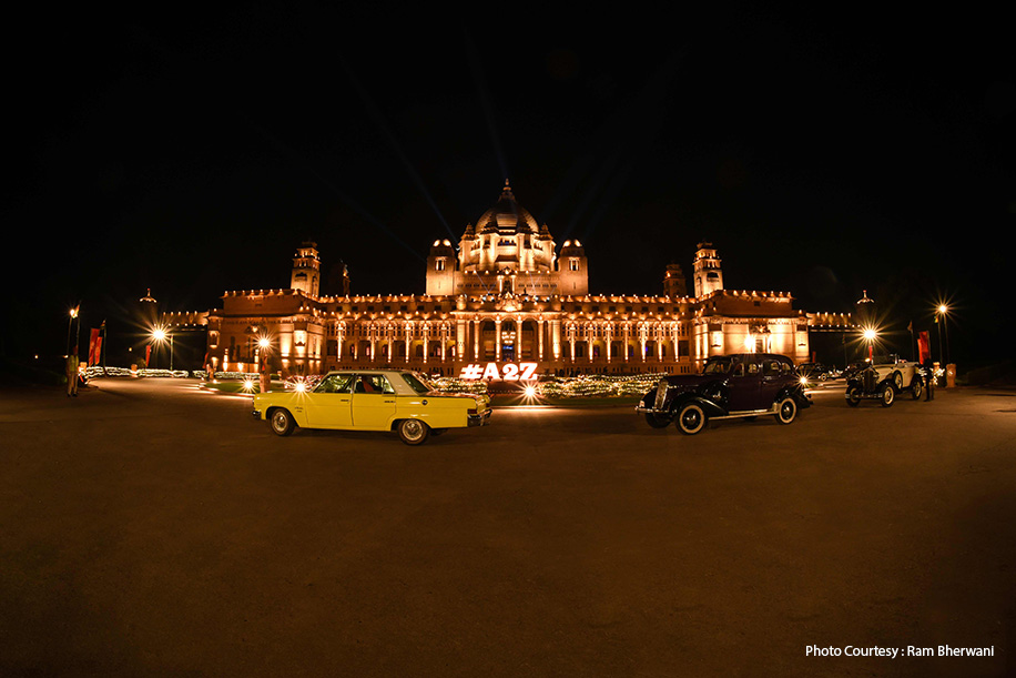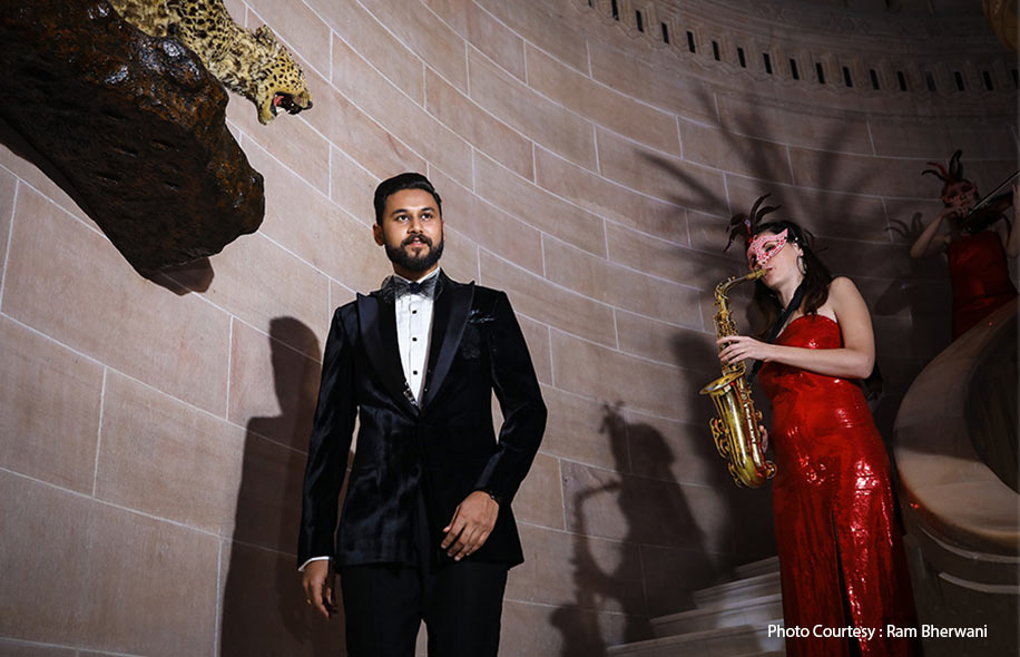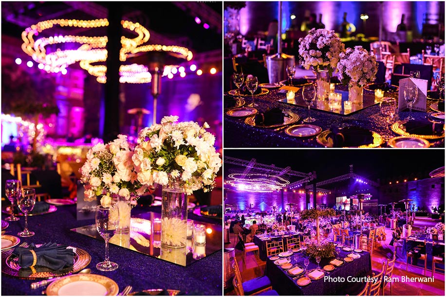 The color theme for this evening was Black, Gold, Purple, and Red. The party began as guests were dropped off to the porch of the Umaid Bhavan Palace in a stunning vintage car. They were then ushered to the pre-function area at the Palm Court by glamorously dressed hostesses. Here, they kick-started the night by welcoming the bride-to-be and groom who entered the Royal Palace to the sound of a magical symphony.