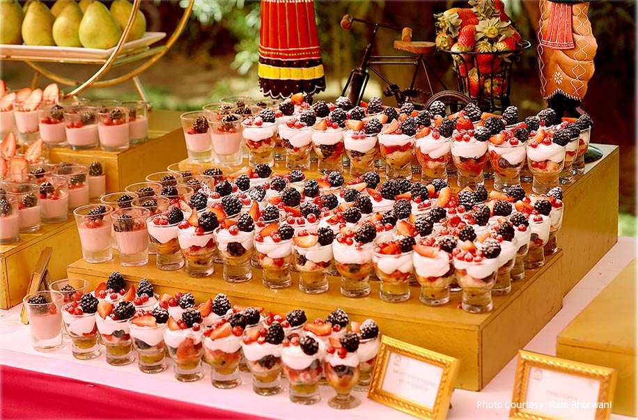 Zubin and Aashna were welcomed to their party by Mirror Man and Mirror Woman. DJ Julia Bliss made one and all groove to her music and the Djembe drummers and beautiful hostesses added to the decadent ambience of this afternoon. The food area was beautifully done up with shades of pink, mirrored tables – rectangular and hexagonal with pink florals.