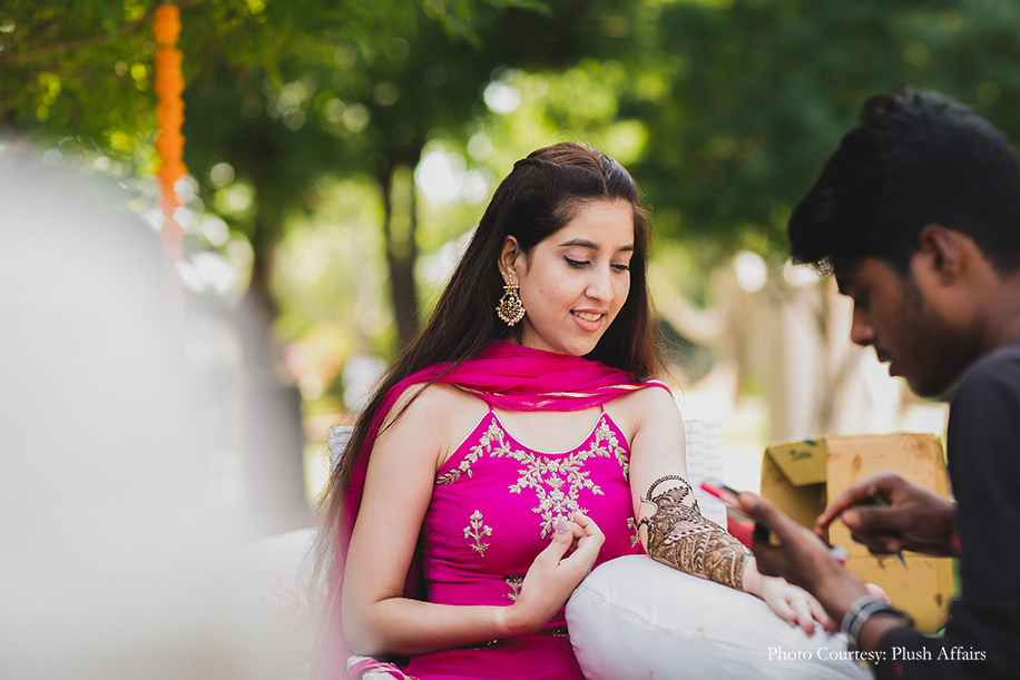 The functions kicked off with a vibrant mehndi with multi-hued floral decor and quirky props that accentuated the beauty of the lush poolside venue and contrasted perfectly with the white vintage seating arrangements. The bride’s cheery fuchsia sharara coordinated perfectly with the groom’s fuchsia pocket square that added a pop of colour to his white kurta and yellow bandi jacket.