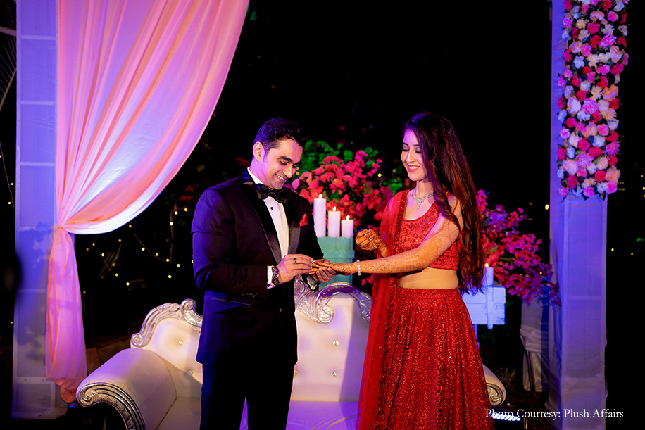 The sangeet function was an elegant soiree with warm lighting, candles, and festooned blooms. The groom looked suave in a classic tuxedo, while the bride dazzled in a shimmering red lehenga and diamond jewellery.