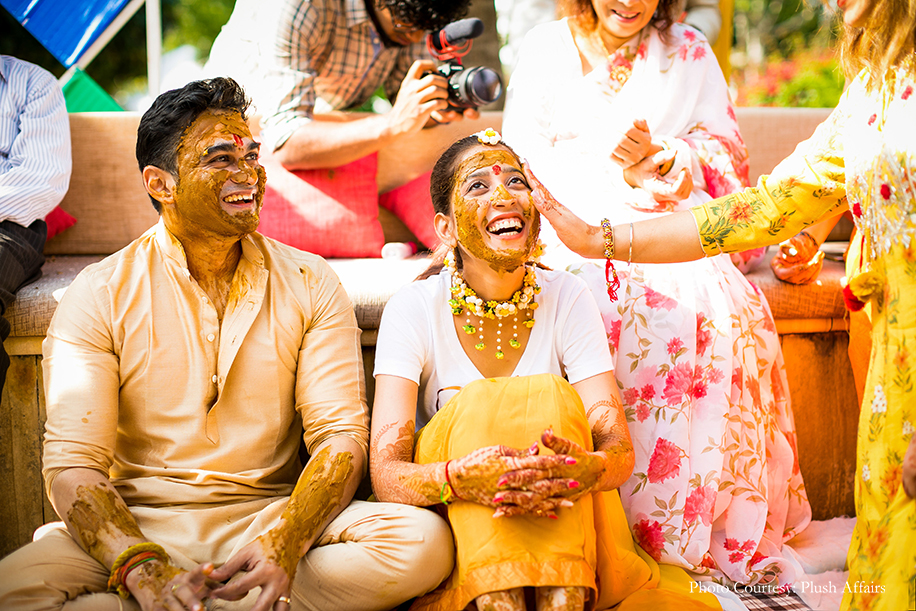 Aditya shares, “We wanted to make the most of the winter sun in the beautiful November weather, so we held most of our functions outdoors. The haldi function was also organized by the poolside, on the sprawling lawns, and it was a vibrant affair with funky and colorful decor.”