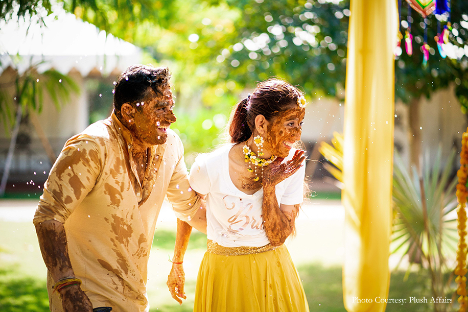 The function was replete merriment as everyone smeared the couple with turmeric paste, but the highlight was definitely the bride’s quirky ensemble. The chic combination of a yellow skirt with a white ‘Bride’ t-shirt and floral jewellery captured her fun and sunny personality.