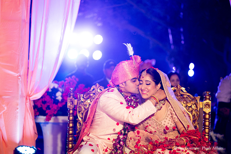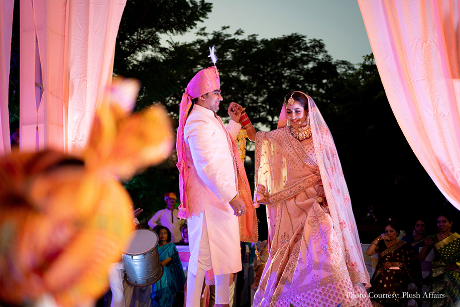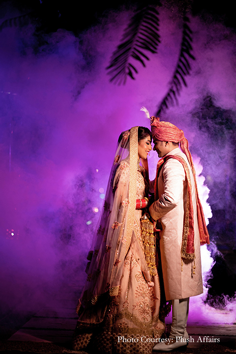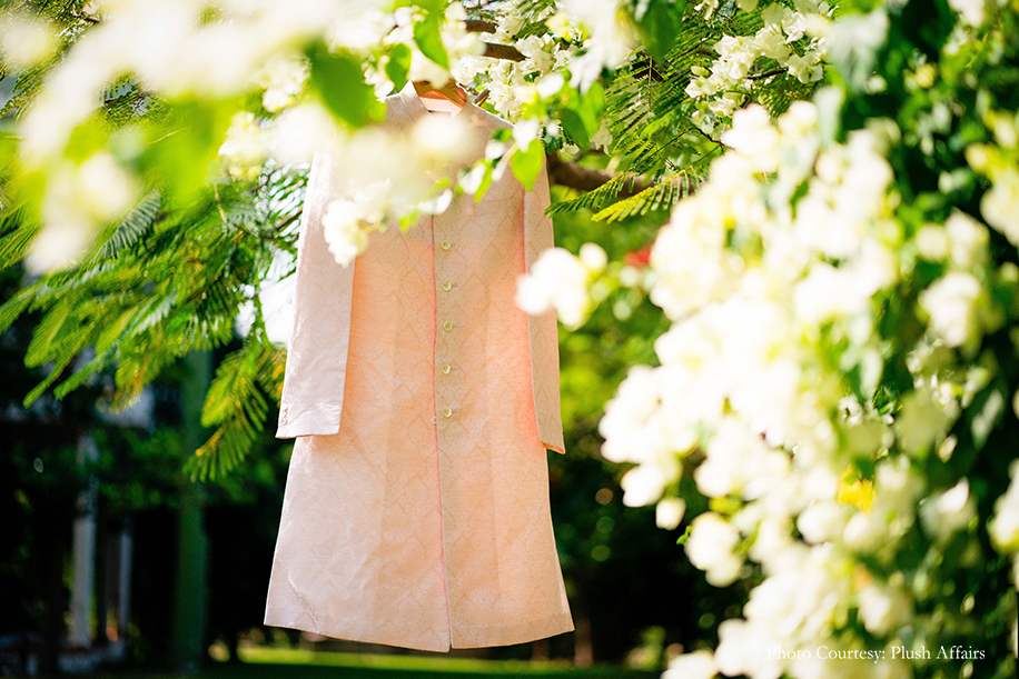 The wedding ceremony was a breezy outdoor affair with pleasing pastel decor. In keeping with the colour palette, the couple wore coordinated outfits in hues of light peach and blush, and exchanged garlands of exotic mauve orchids.