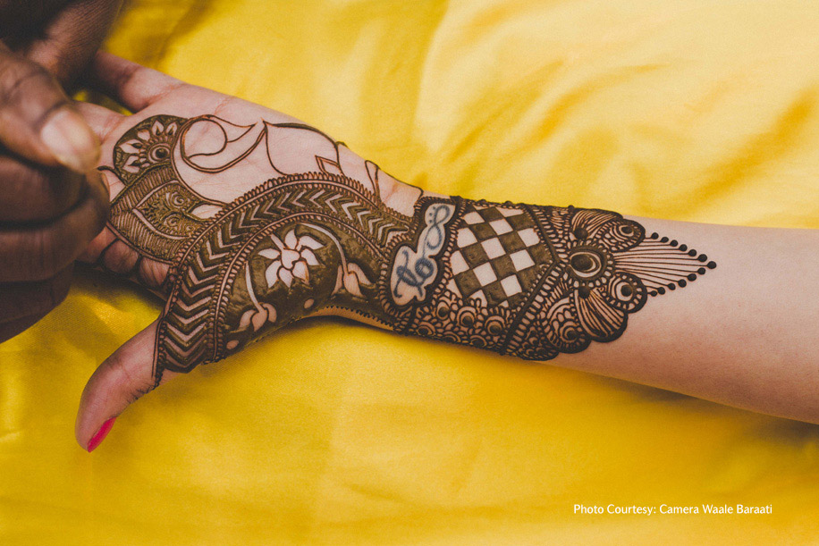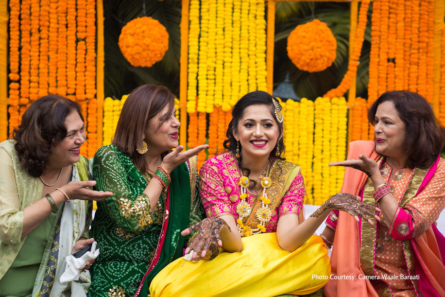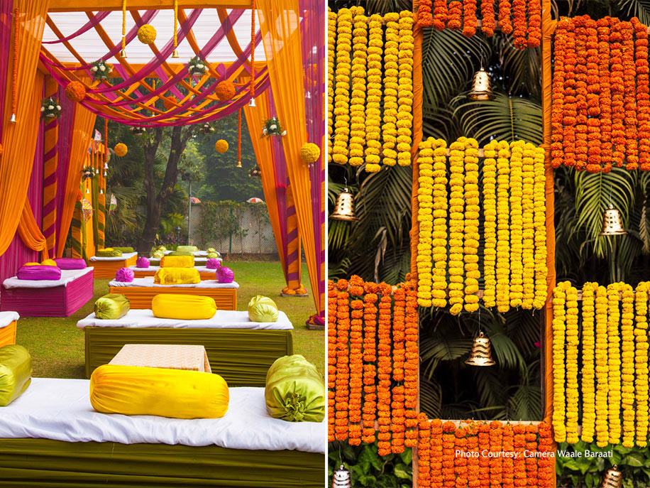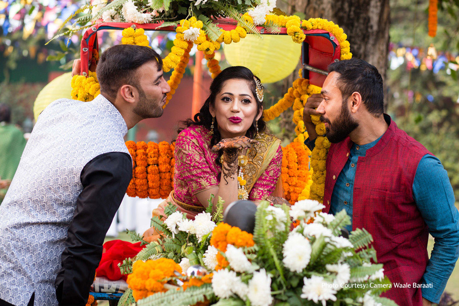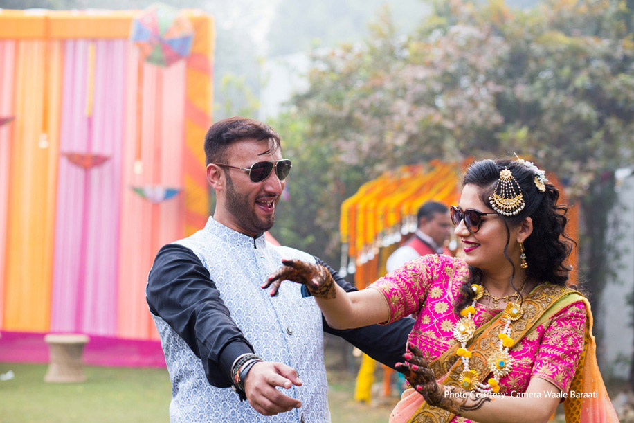 “I wanted a very colorful mehndi on a winter afternoon, and Anshul’s childhood friend Jalaj Narang did a stupendous job creating a setup that was bursting with bright colors and filled with interesting elements. The main colors at the event were pink, orange and yellow and golden accents in the form of bells which added a hint of glitz to the setup. There was a swing that was swathed with yellow and orange marigolds, a canopy where buntings were woven with each other to create an interesting ceiling, a large backdrop that looked like a checkerboard made with marigold blooms and many beautiful features. I was in awe of his work. All our guests also loved the decor, especially the decorated cycle-rickshaw that was a part of the setup. I wore a pink and green lehenga from Ravissant while Anshul picked a black and white outfit from Karan and Moin.”