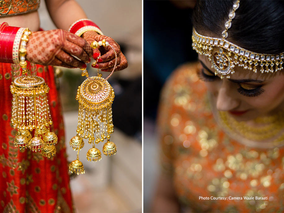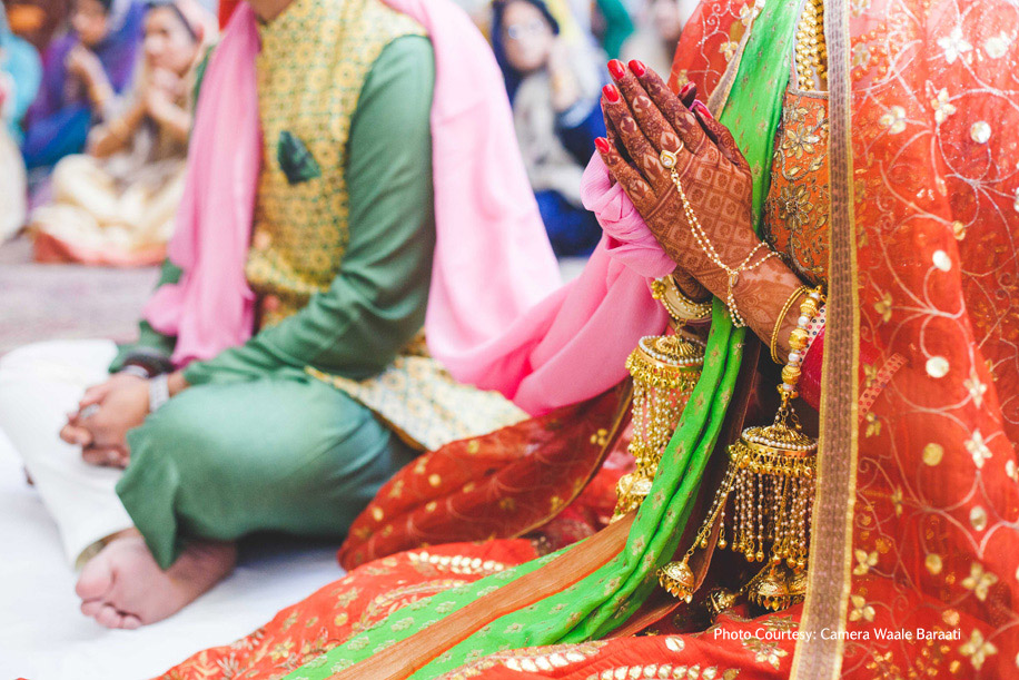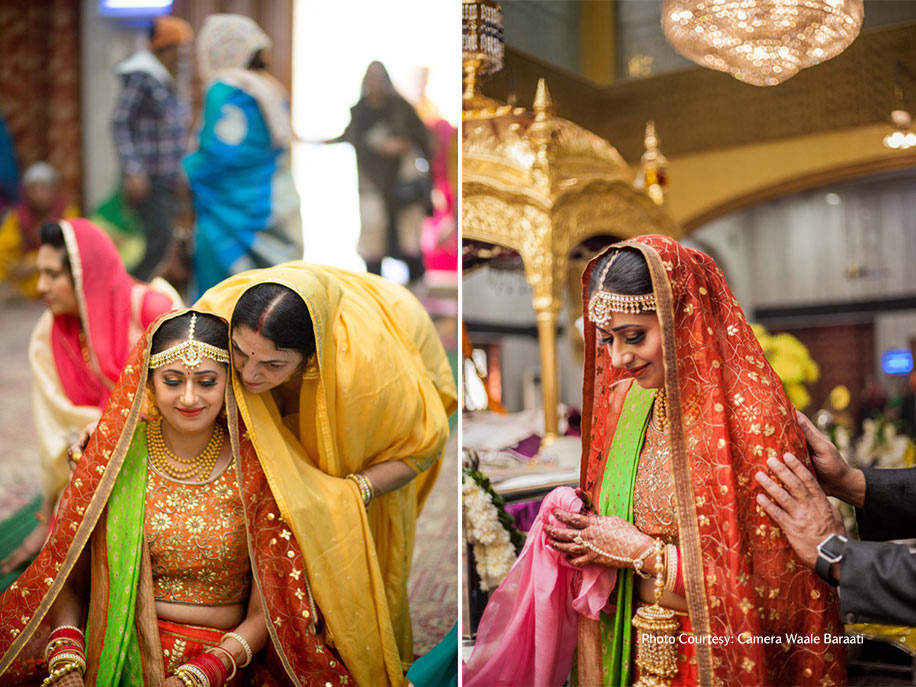 “Our wedding ceremony which took place the following day was a fairly simple affair. We exchanged our vows at the Gurudwara after which Anshul and I rode away on a bike! Anshul is an avid biker so took me home on his prized Triumph Bonneville motorbike. My ‘doli’ (palanquin) was something that was loved by everyone at our wedding. Once again I wore a creation from Ravissant. Anshul’s ensemble was Karan and Moin. My lehenga and blouse were made in different shades of orange and paired with a green dupatta with all over golden work. Anshul’s green outfit matched my attire perfectly.”