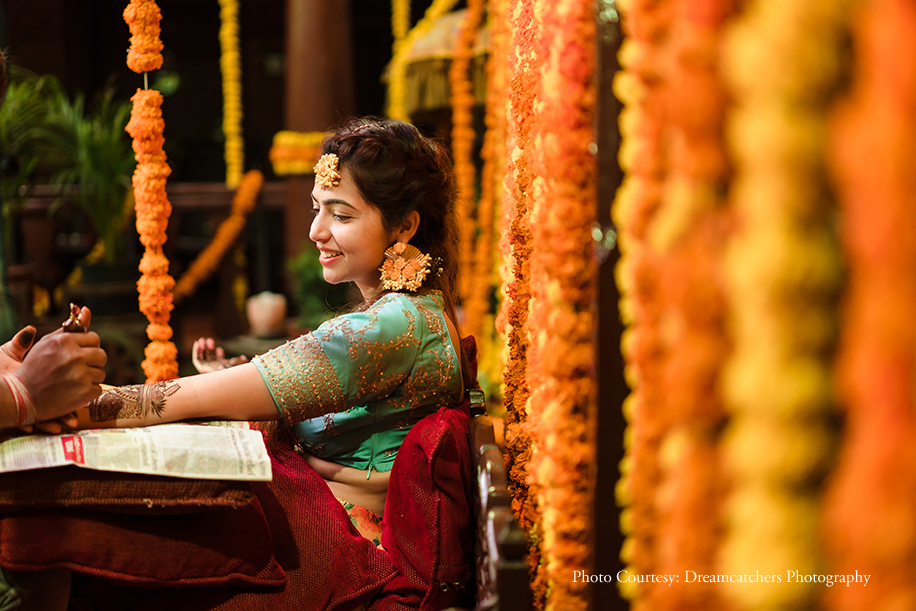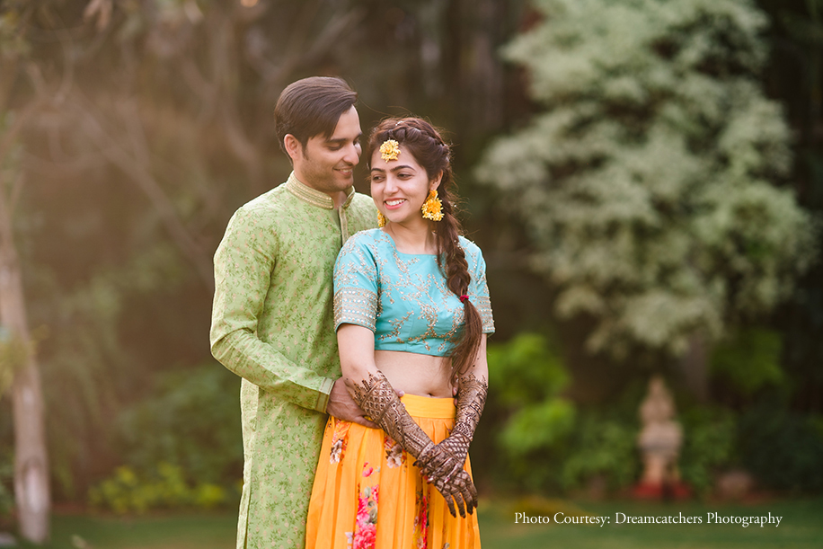 Commencing with a lively mehndi ceremony, the duo’s nuptials started off on a high note as Aakriti got henna patterned on her palms. “Following the theme ‘bring out the colors’, the mehndi ceremony was a vivid affair where the guests came garbed in bright hues. For the decor, we chose traditional marigolds that added more cheer to the proceedings.”, shares the bride.