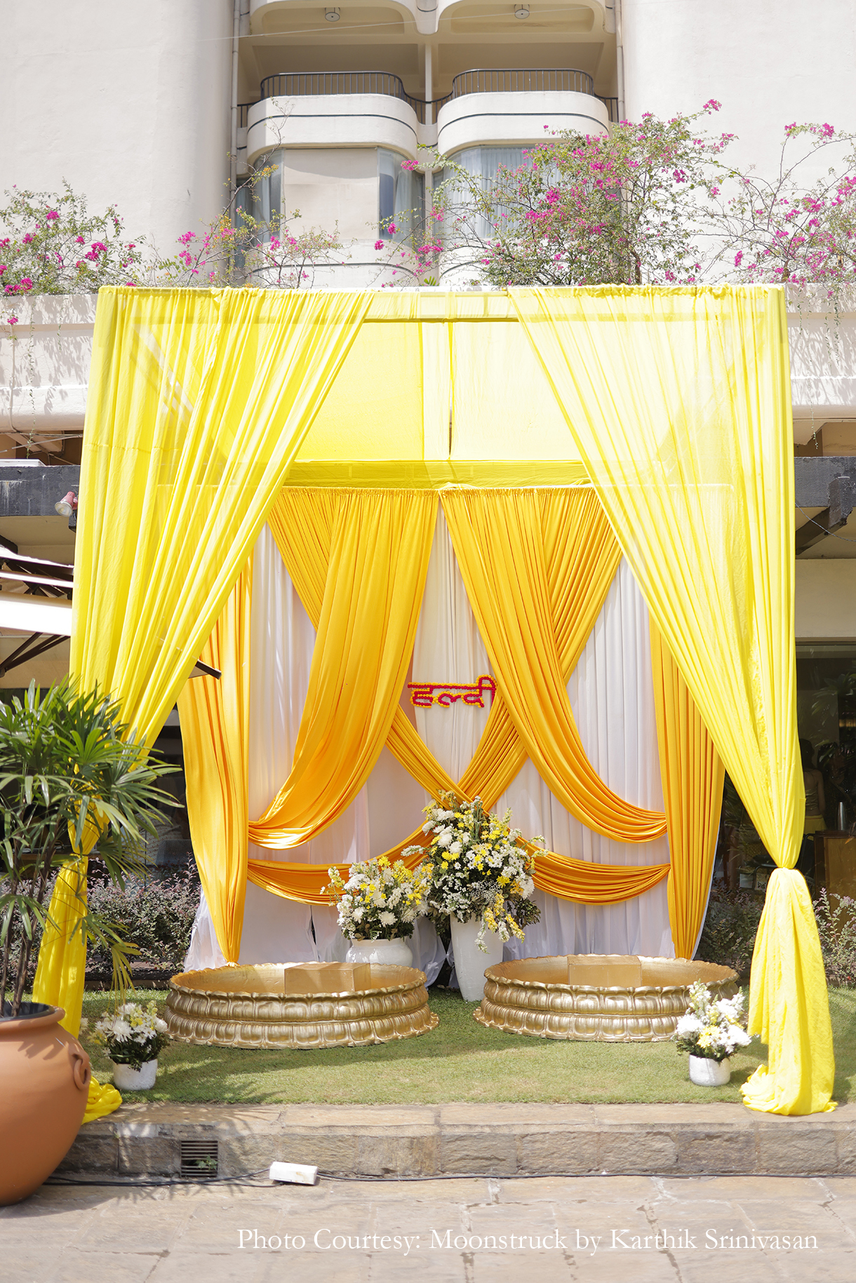 “Our Haldi ceremony was a burst of sunshine— held poolside. The décor was a perfect mix of yellows, oranges, and whites. The vibrant setup, against the backdrop of the serene pool, set the tone for a fun and joyous day. With laughter, music, and playful splashes of haldi, it was a ceremony that radiated happiness and warmth, surrounded by the closest members of our families”, the couple shared.
